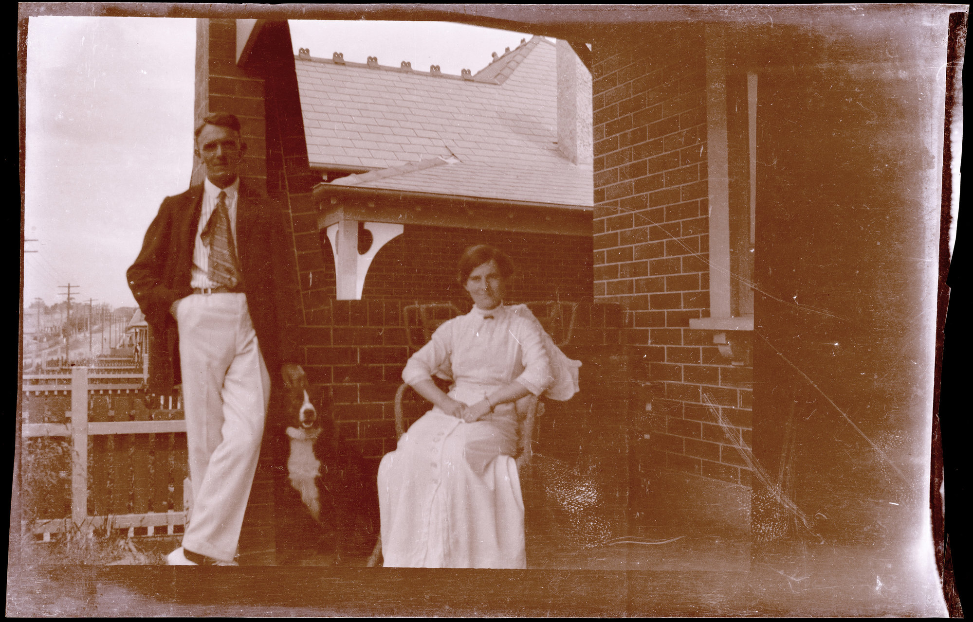 Man, woman and pet dog, on verandah of residence (film negative)