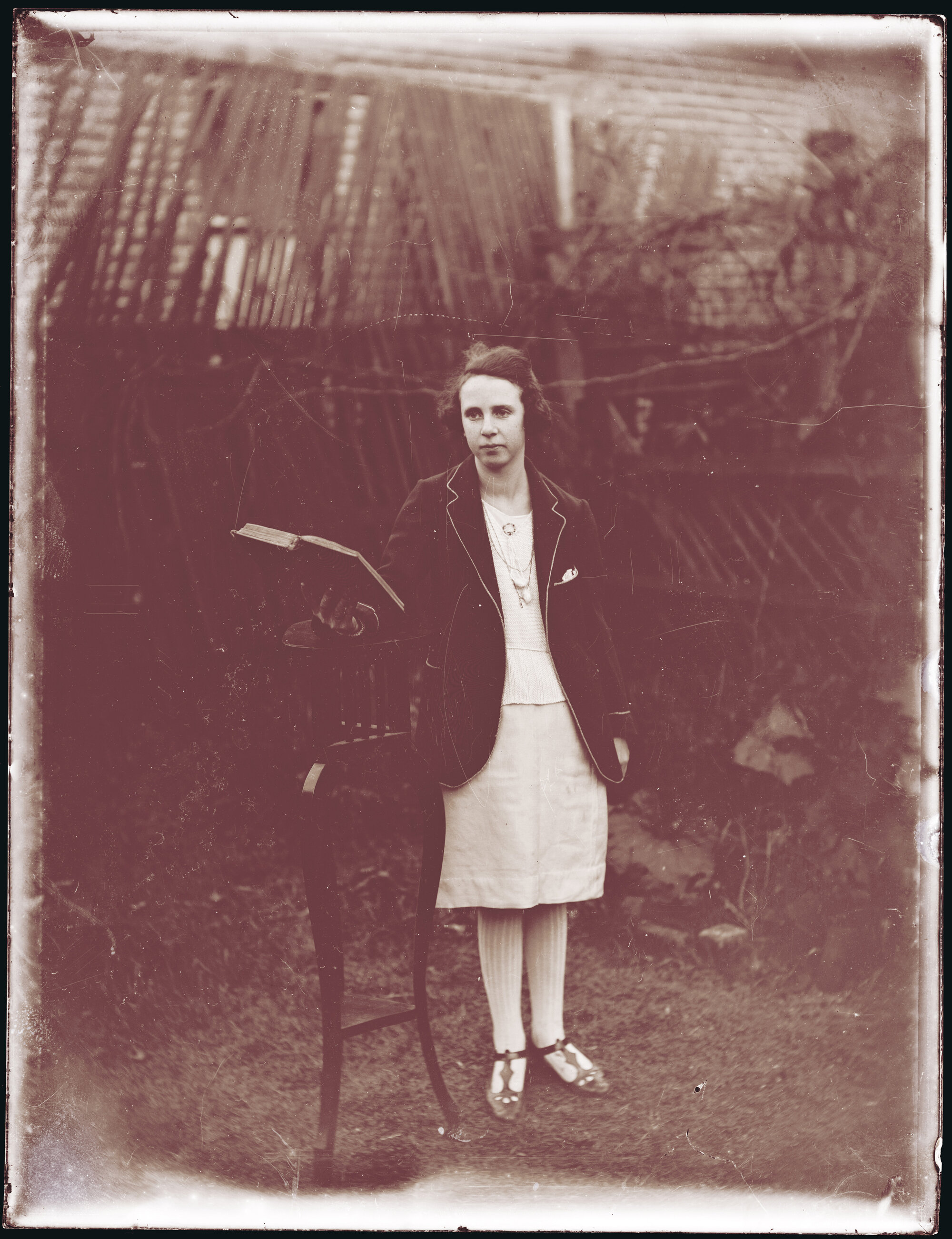 Woman holding opened book in backyard, [ARODGN_0275]. Living Histories, accessed 17/04/2026, https://livinghistories.newcastle.edu.au/nodes/view/32742