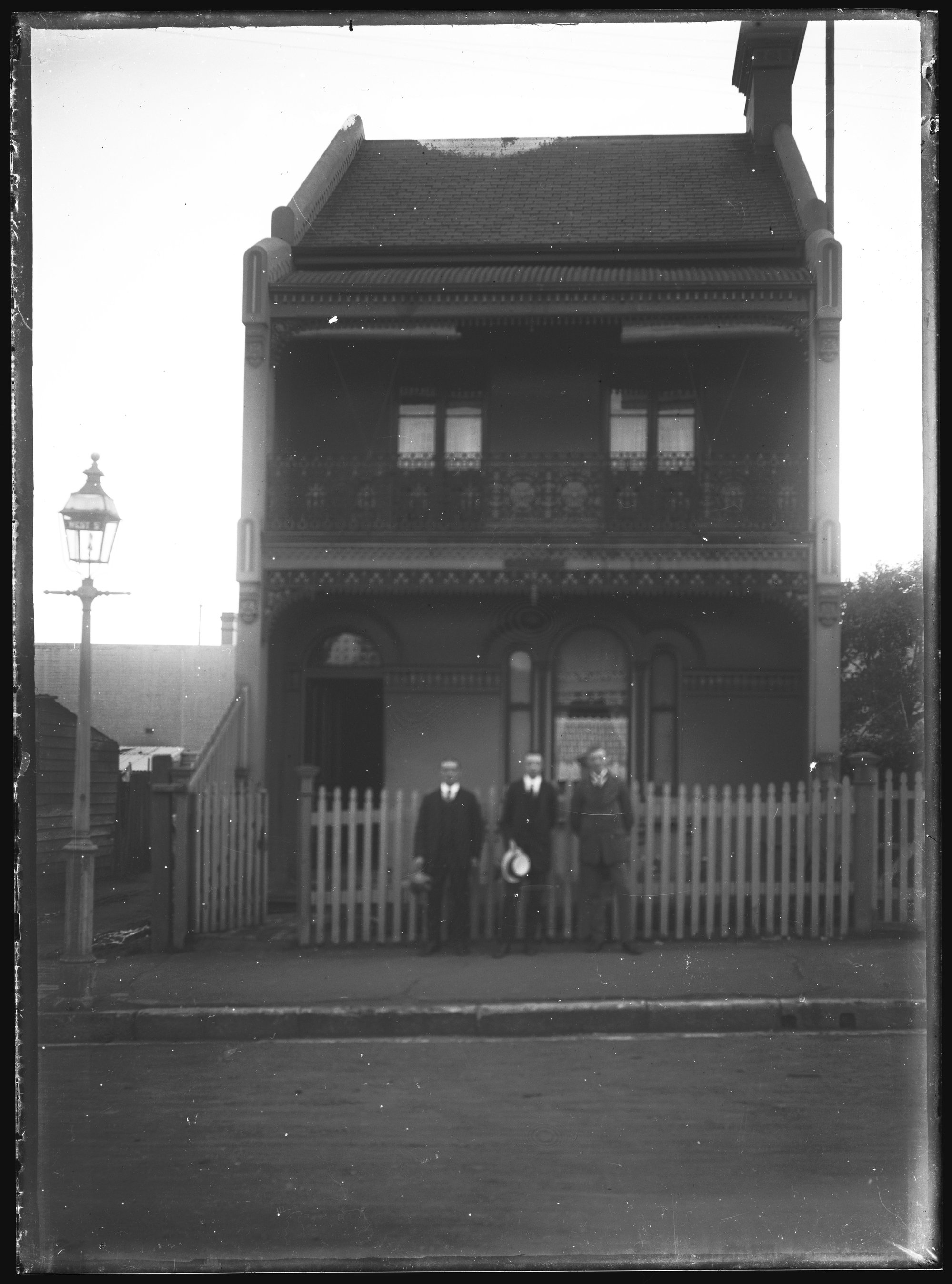 Unidentified residence, "West Street" south of Parramatta Road on West Street, Petersham, New South Wales (?), with three gentleman, c1910s
