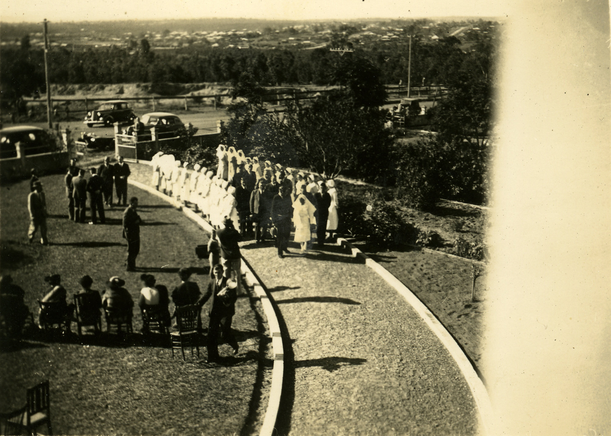 Nursing staff forming a guard of honour in front of the Kurri Kurri District Hospital, NSW, [n.d.], [OL_CHG_Kurri_068a]. Living Histories, accessed 20/01/2026, https://livinghistories.newcastle.edu.au/nodes/view/33050