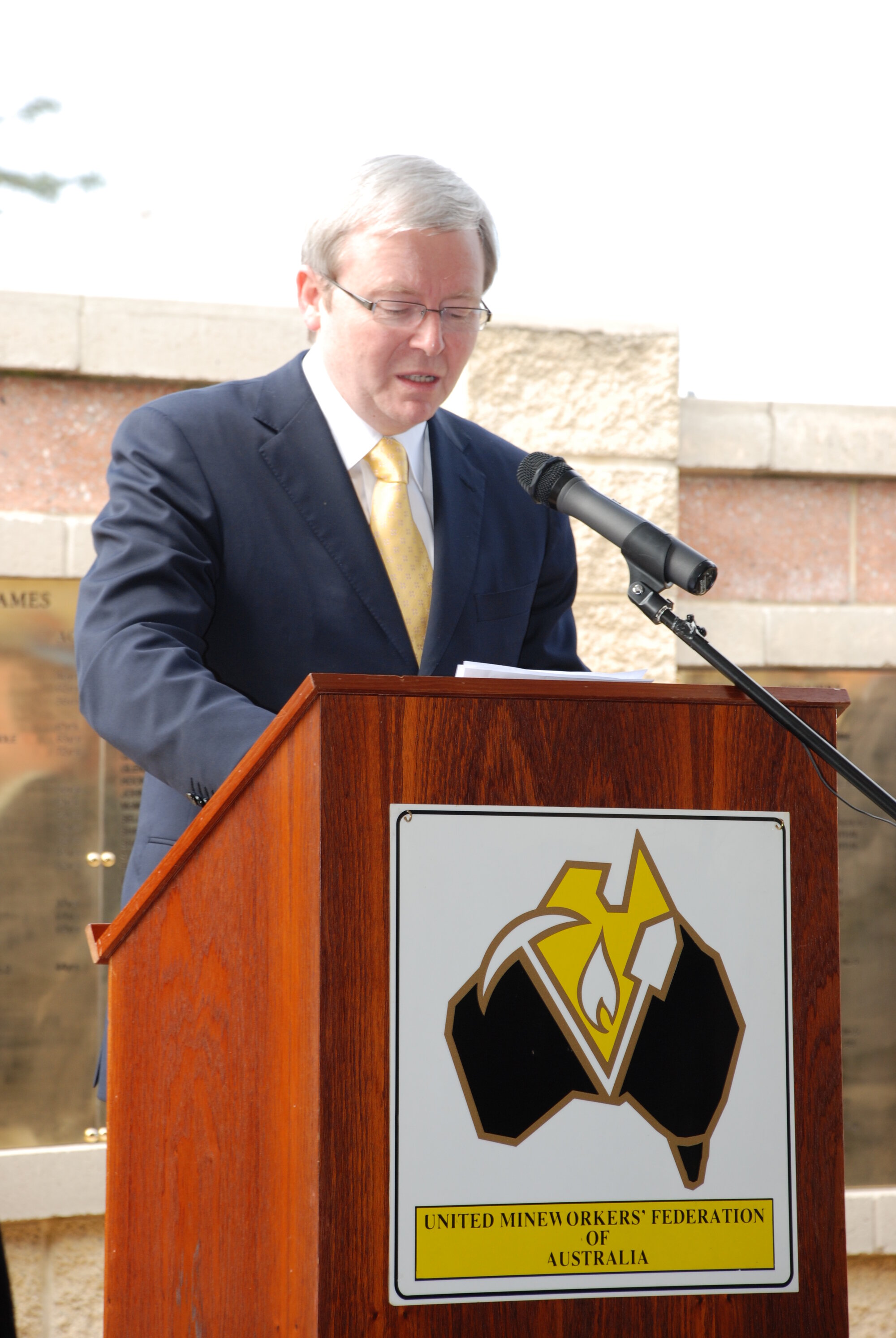Prime Minister Kevin Rudd speaking at the memorial service at the Jim Comerford Miners Memorial Wall, Aberdare, NSW, 2007