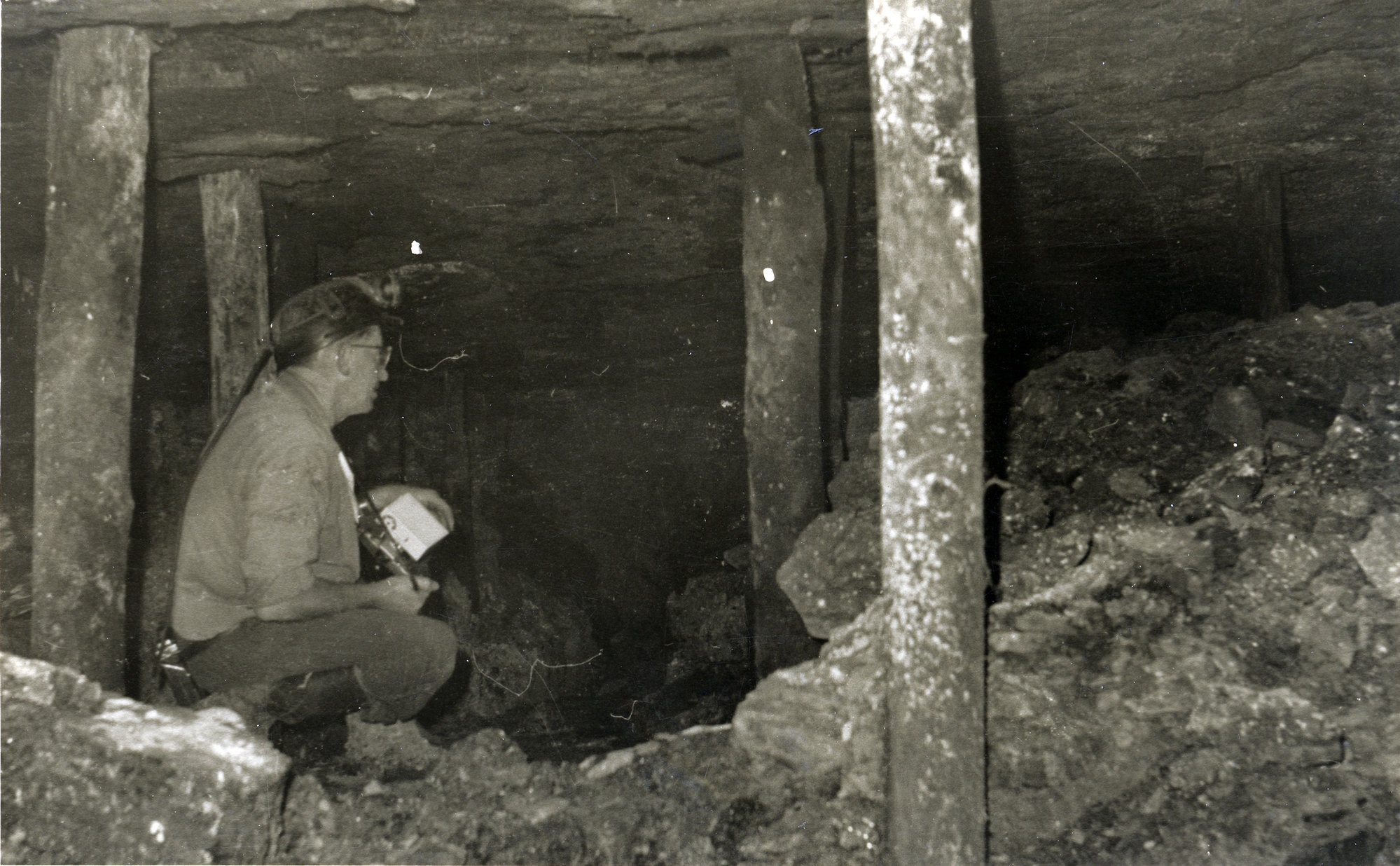 Old East Maitland series mine workings found by Bloomfield No 4 Colliery, 1967. View at point of breakin. Note that while the official has an electric-cap lamp, he is using a flame-safety lamp to detect noxious gases which might emit from the old workings