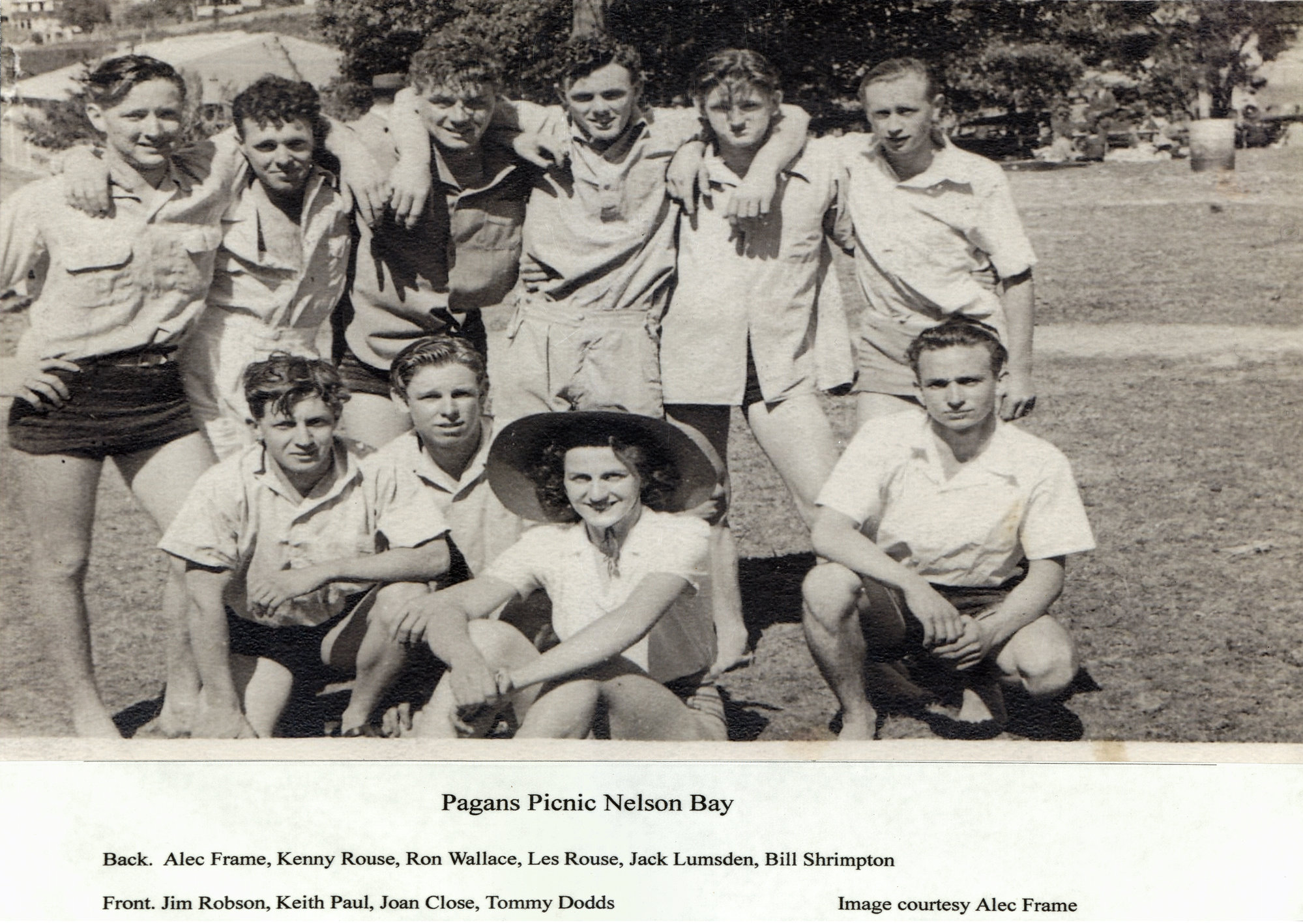 Pagans Picnic, Nelson Bay. Back: Alec Frame, Kenny Rouse (Rowse), Les Rouse (Rowse), Jack Lumsden, Bill Shrimpton. Front: Jim Robson, Keith Paul, Joan Close, Tommy Dodds.