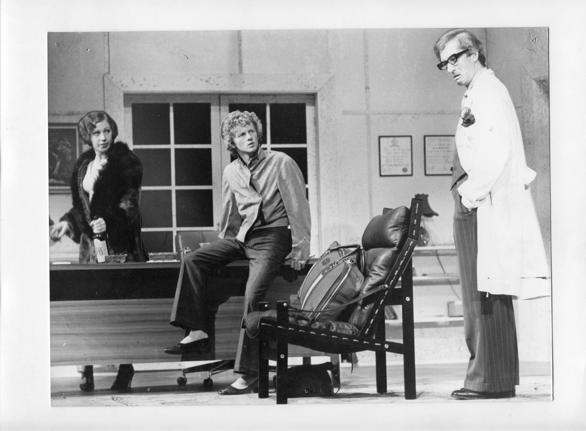 Pat Bishop (Mrs Prentice), Chris Benaud (Nicholas), Alan Becher (Dr Prentice) in What the Butler Saw by Joe Orton, directed by Terence Clarke, designed by Eamon D'Arcy; Hunter Valley Theatre Company production at the Hunter theatre, Merewether, 1977., [A9029-245]. Living Histories, accessed 12/02/2026, https://livinghistories.newcastle.edu.au/nodes/view/3435