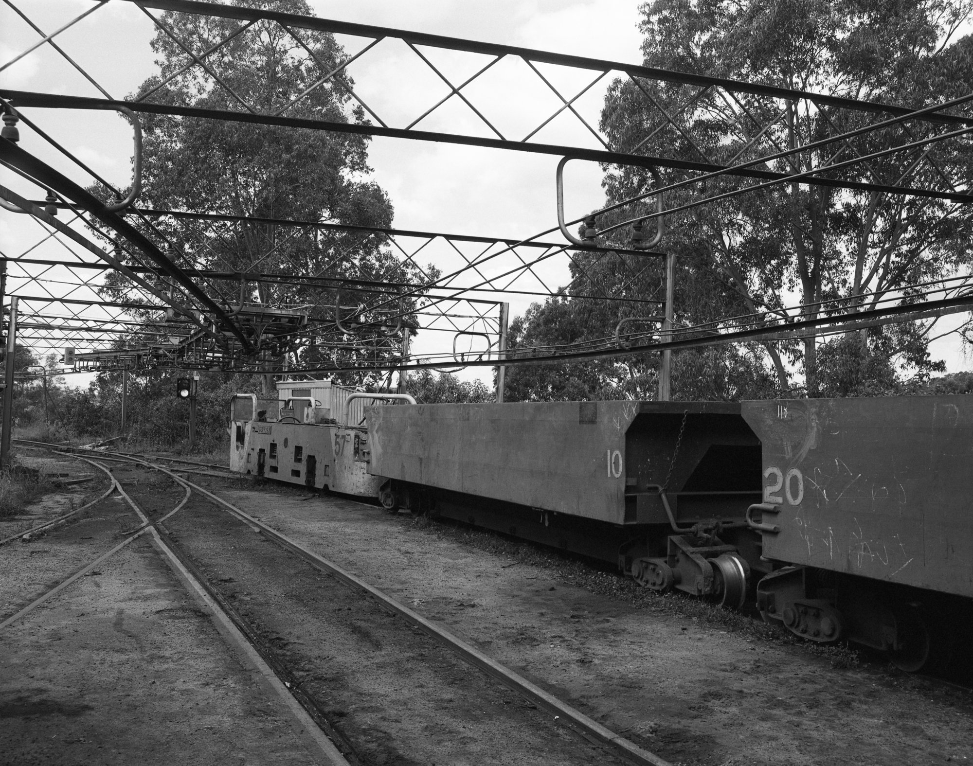 Andrews, Brian Robert, Locos No 57 and 55, scenes on surface, Trolley wire loco system, Stockrington No 2 Colliery, Nov 1983 (1983), [OL_BRAN420_007]. Living Histories, accessed 20/03/2026, https://livinghistories.newcastle.edu.au/nodes/view/34818