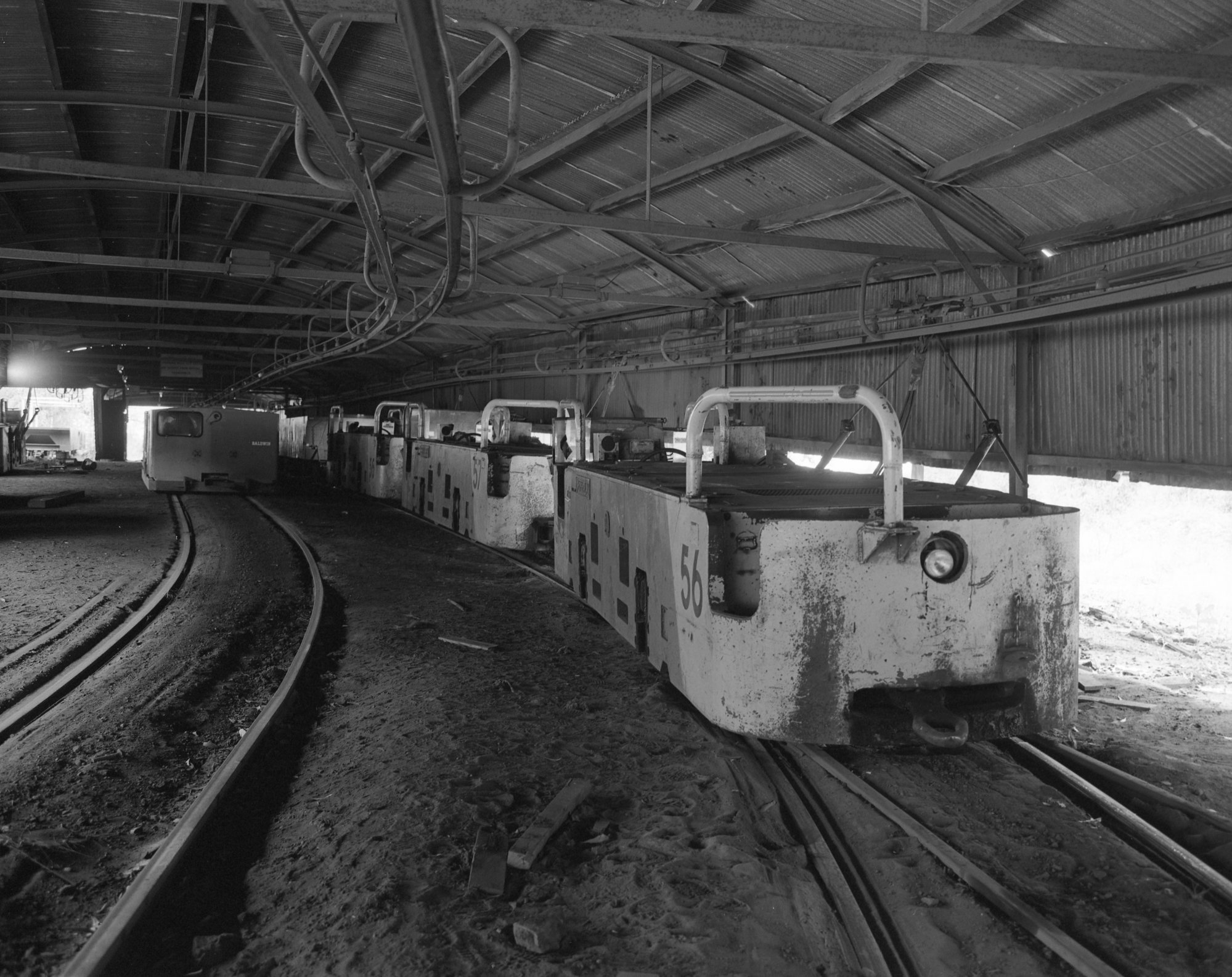 Andrews, Brian Robert, Loco No 56 at loading point, Locos 55, 57 and 56 in line on surface, Buchanan loading point, Stockrington No 2 Colliery, Nov 1983 (1983), [OL_BRAN415_009]. Living Histories, accessed 18/03/2026, https://livinghistories.newcastle.edu.au/nodes/view/34865