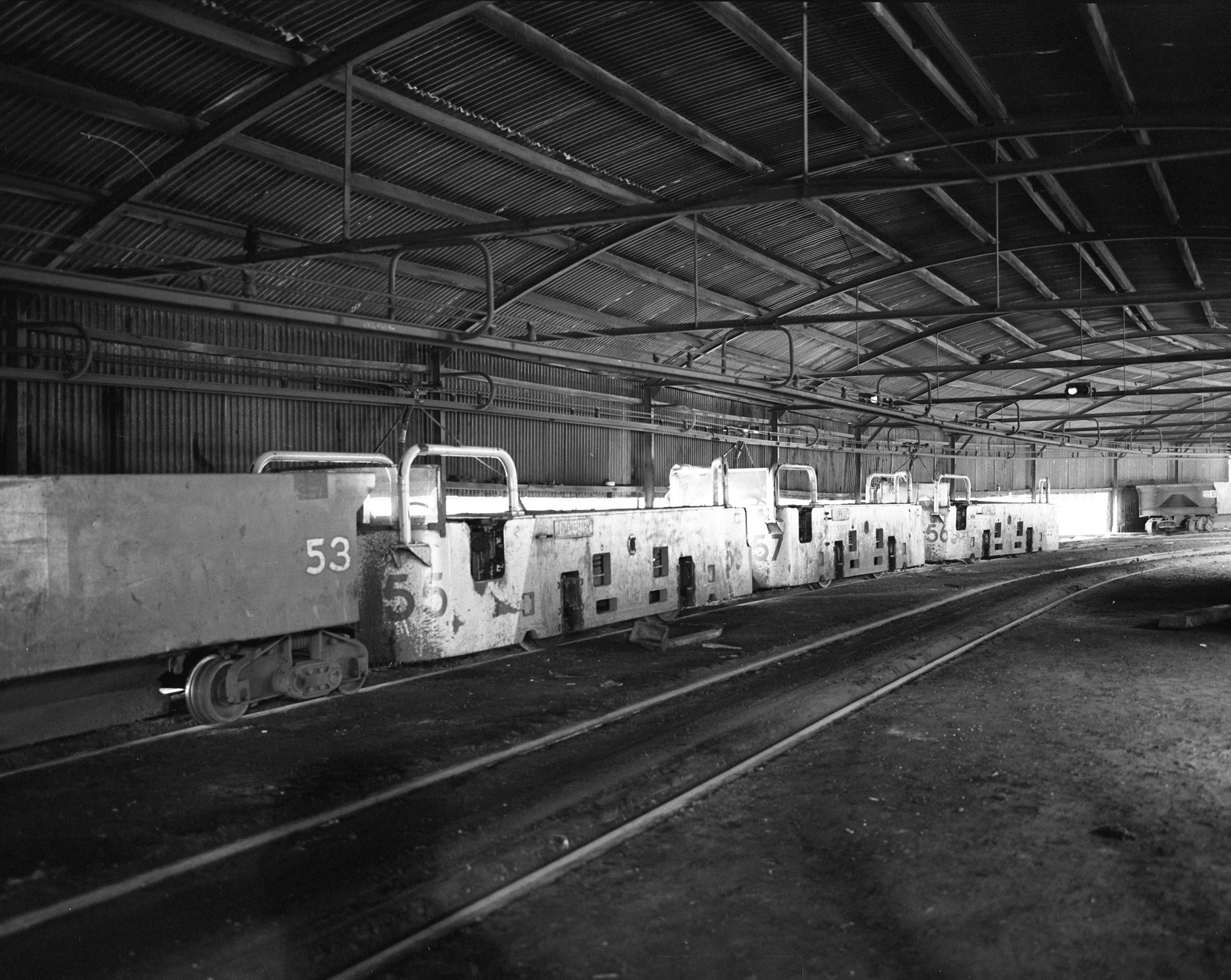 Andrews, Brian Robert, Loco No 56 at loading point, Locos 55, 57 and 56 in line on surface, Buchanan loading point, Stockrington No 2 Colliery, Nov 1983 (1983), [OL_BRAN415_007]. Living Histories, accessed 19/03/2026, https://livinghistories.newcastle.edu.au/nodes/view/34867