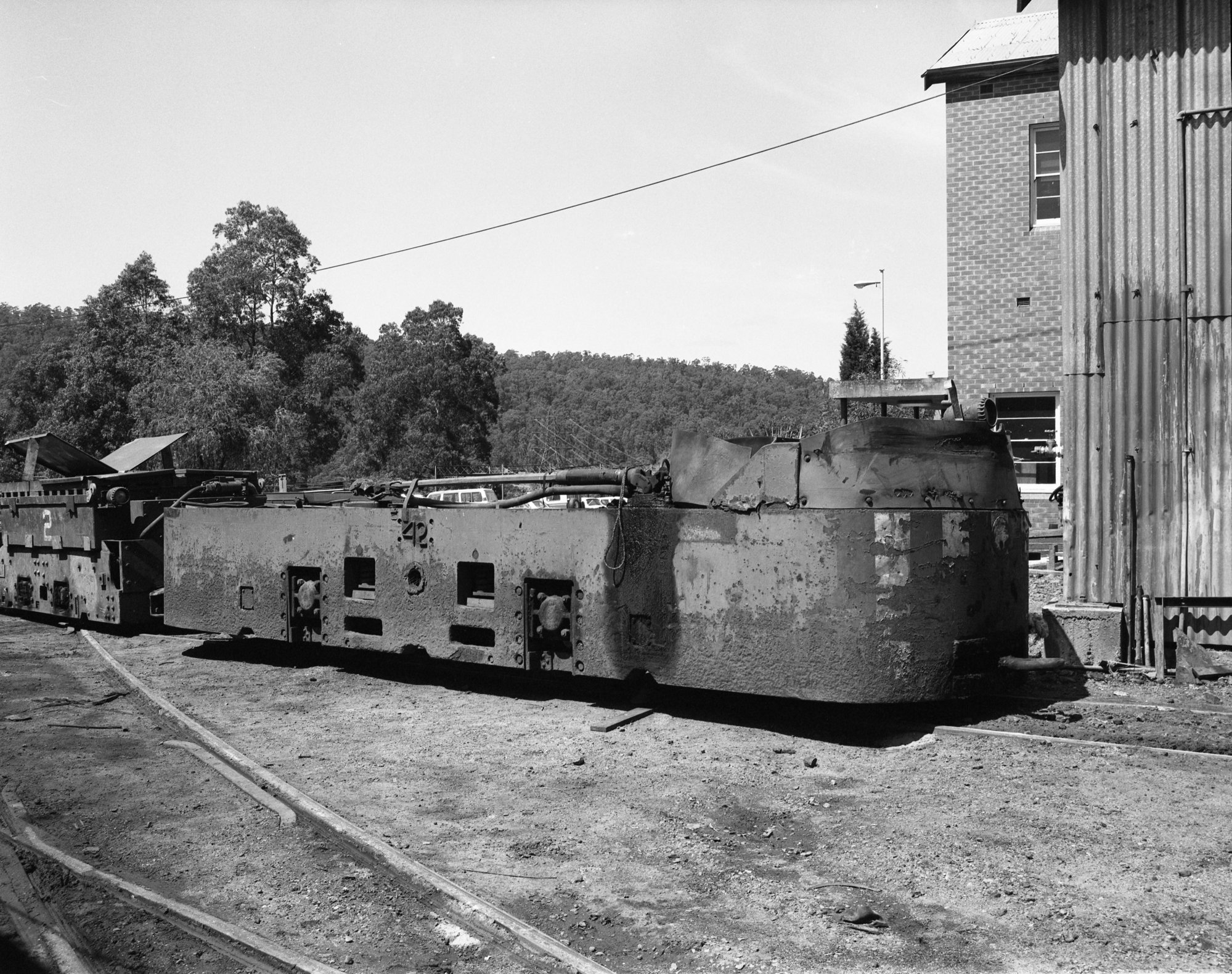 Trolley wire loco system, scenes of locos on bin at surface, loco ex Awaba state mine (spare parts), Stockrington No 2 Colliery, Nov 1983