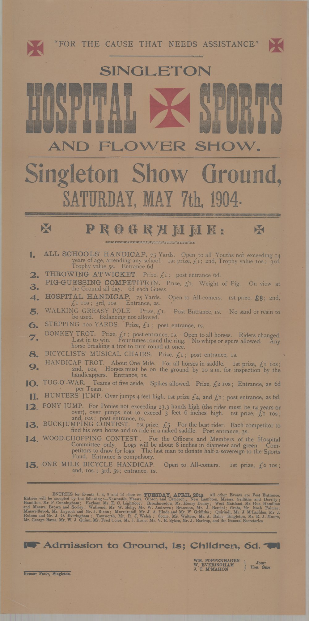 Poster - Singleton Hospital Sports and Flower Show, Singleton Show Ground, 7 May 1904 (7th May 1904), [A5059]. Living Histories, accessed 14/04/2026, https://livinghistories.newcastle.edu.au/nodes/view/3517