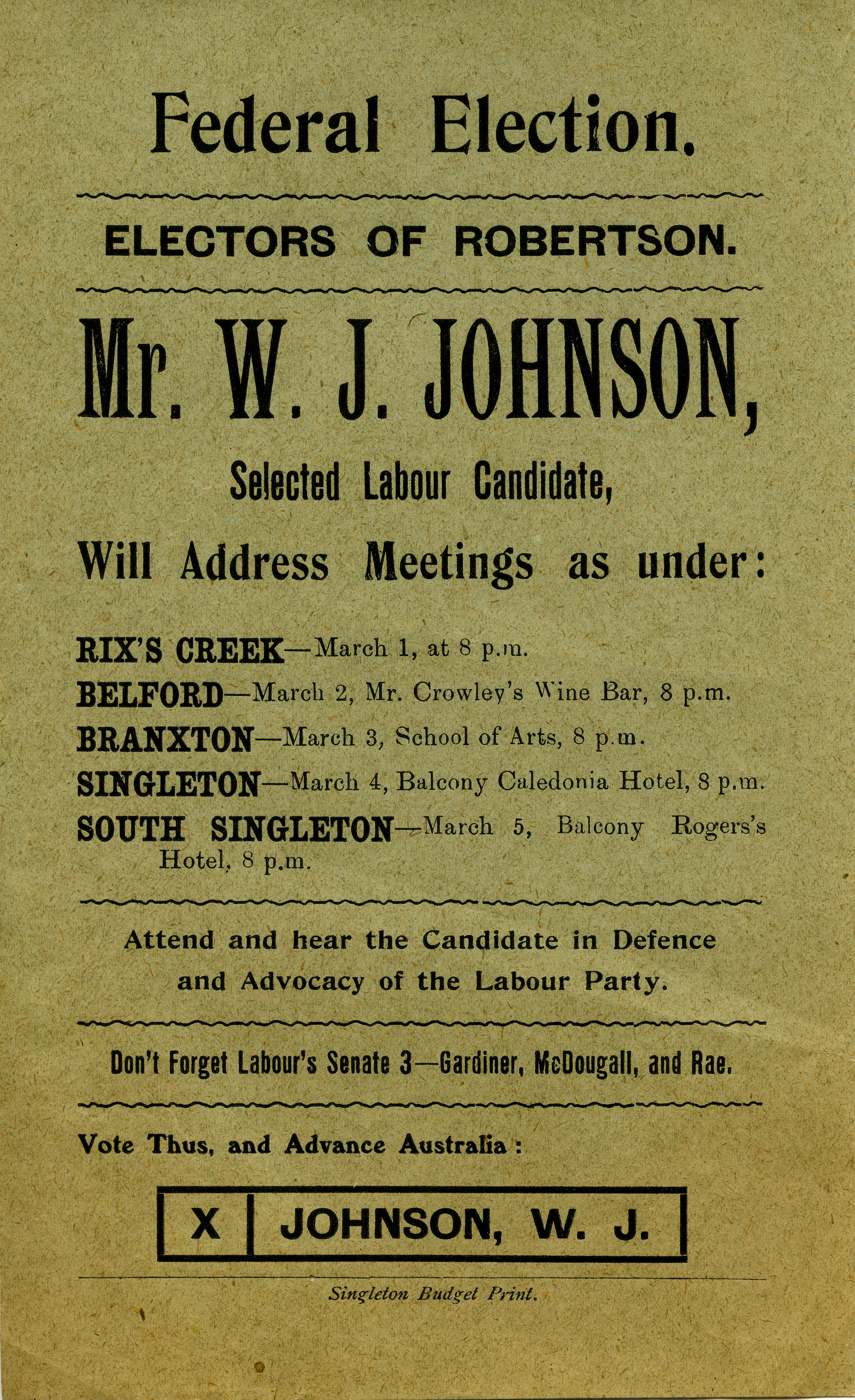 Federal Election flyer for W. J. Johnson, [A5059(lxxviii) ]. Living Histories, accessed 16/04/2026, https://livinghistories.newcastle.edu.au/nodes/view/3538