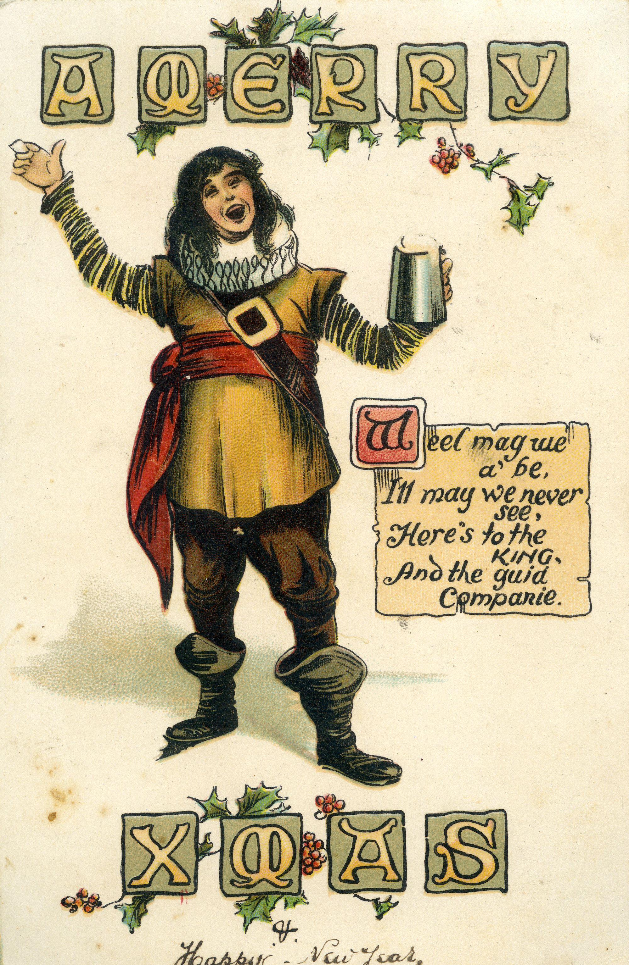 A Merry Xmas. Weel may we a' be. Ill may we never see. Here's to the King, And the guid Companie. Postcard sent from Aberdeen by F.R.M. (Francis Richard Moore) to his brother, W.J. (William Joseph) Moore, Esq. Customs House, Newcastle, 12 Feb 1907., [MooreAlbum-104]. Living Histories, accessed 19/03/2026, https://livinghistories.newcastle.edu.au/nodes/view/35528