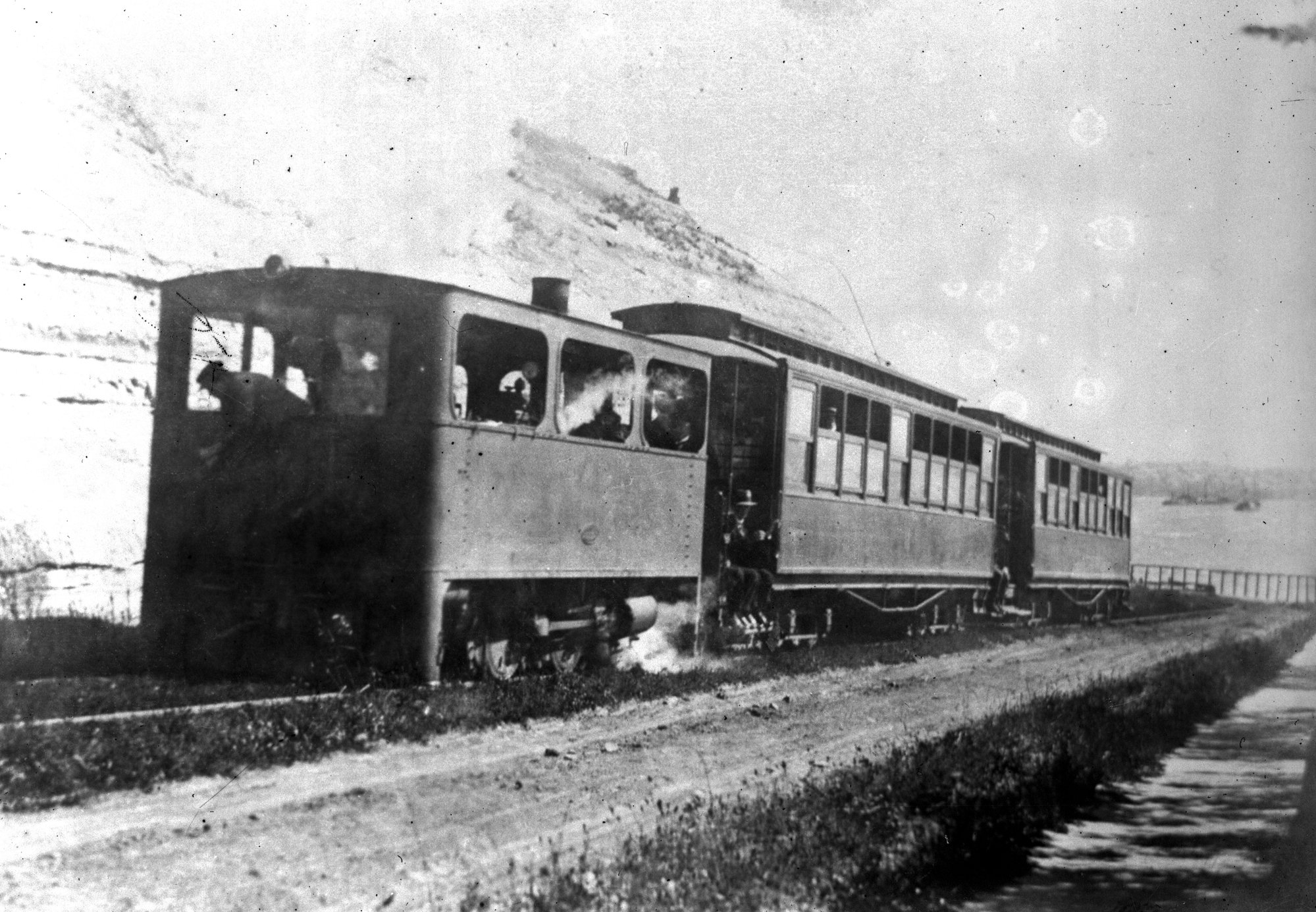Takapuna Tramway & Ferry Co, Steam Tram Motor & trailers, beach front, Auckland, N.Z., [1920s] ([1920s]), [ARHSBox027_0843]. Living Histories, accessed 16/02/2026, https://livinghistories.newcastle.edu.au/nodes/view/3605