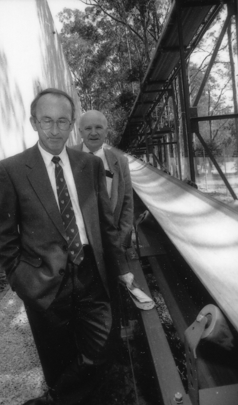 Professor Alan Roberts with an unidentified gentleman inspect the bulkmat conveyor belt, the University of Newcastle, Australia