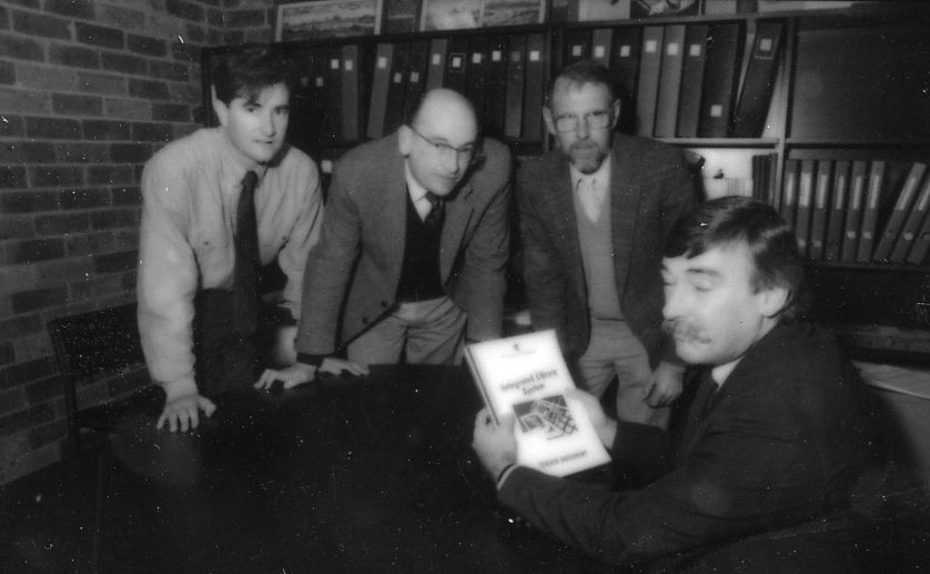 University Librarian, Mr. Bill Linklater (far right sitting), Mr. Greg Anderson (far left), Mr. Peter Myers (2nd right) with an unidentified man, inspect an intergrated library tender document, the University of Newcastle, Australia - 1990s
