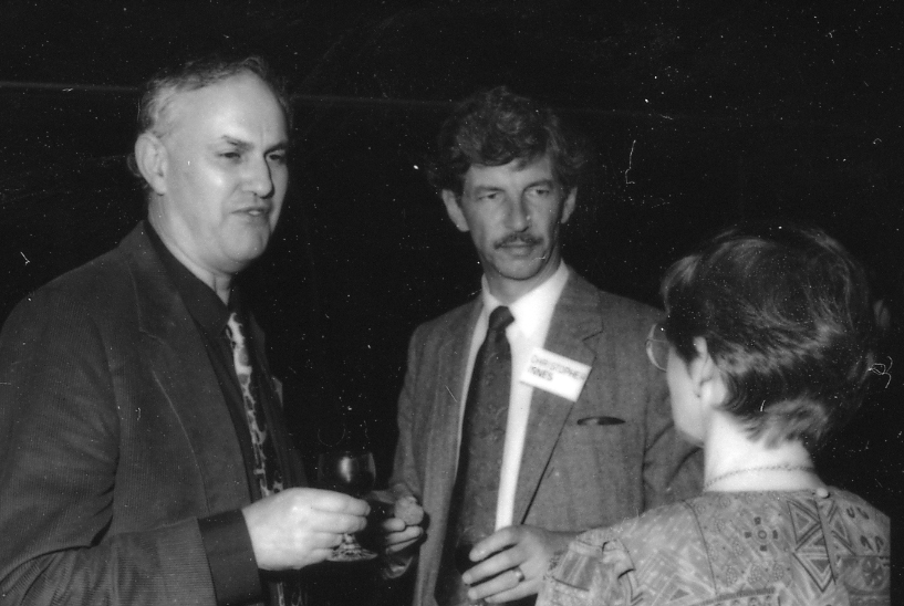 Professor David Frost (Department of English) with two unidentified people at an unspecified function, the University of Newcastle, Australia, [P3018-4f]. Living Histories, accessed 19/03/2026, https://livinghistories.newcastle.edu.au/nodes/view/38343