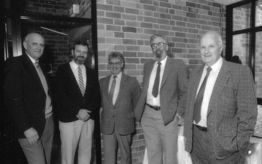 Professor Alan Roberts (right) with four unidentified gentlemen, the University of Newcastle, Australia