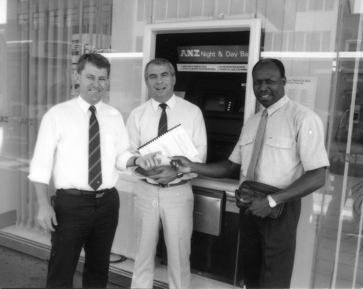 Dr Robert Rugimbana with two unidentified men at the launch of the ANZ branch on campus, the University of Newcastle, Australia - 13 February, 1992