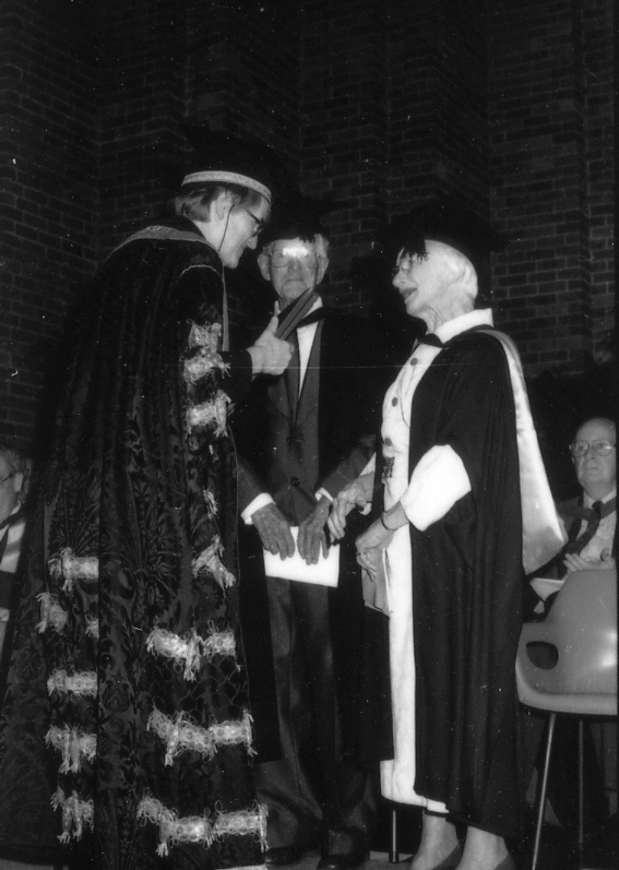 Chancellor, Elizabeth Evatt presents an unidentitified couple with their Honourary Degrees in the Great Hall, the University of Newcastle, Australia - 2 May, 1992