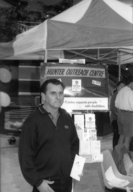 An unidentified man standing in front of a poster for the Hunter Outreach Centre, Stockland Shopping Centre, Jesmond, Australia - 1992 (1992), [P3016-19a]. Living Histories, accessed 16/04/2026, https://livinghistories.newcastle.edu.au/nodes/view/38905