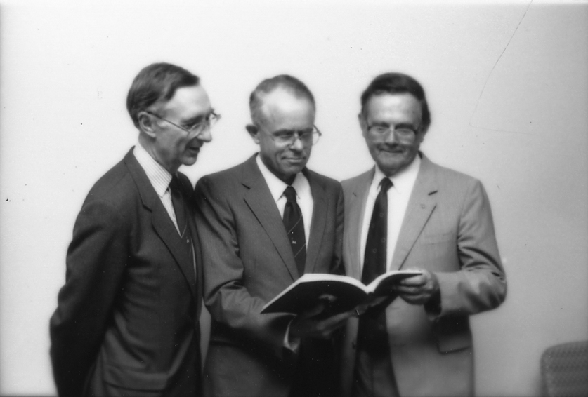 Vice-Chancellor, Professor Keith Morgan, Dr. Don Wright and Professor Don George inspect a copy of Dr Wright's book detailing the history of the University of Newcastle, Australia - April, 1992