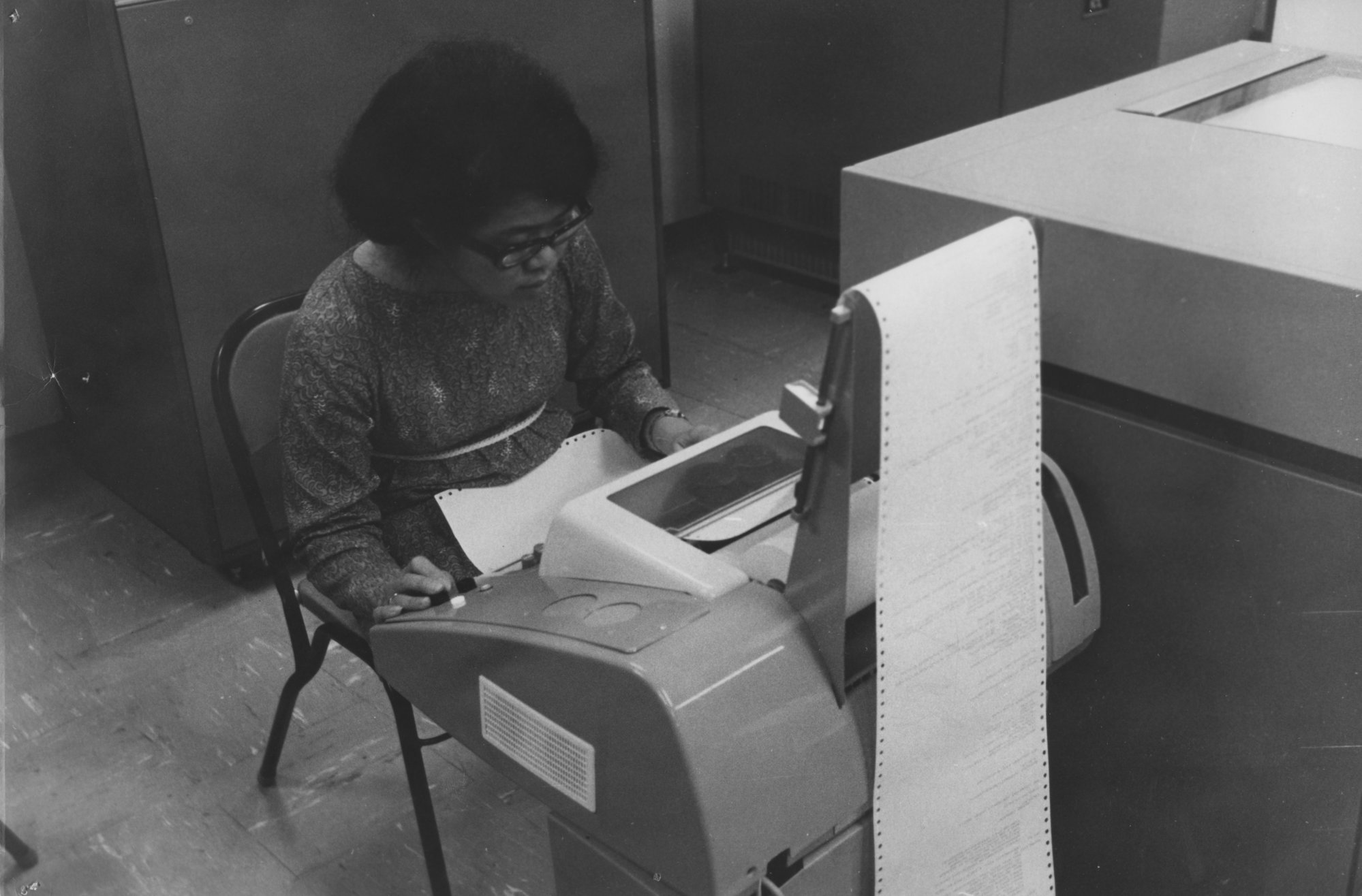 An unidentified computer operator using a dumb terminal, the University of Newcastle, Australia