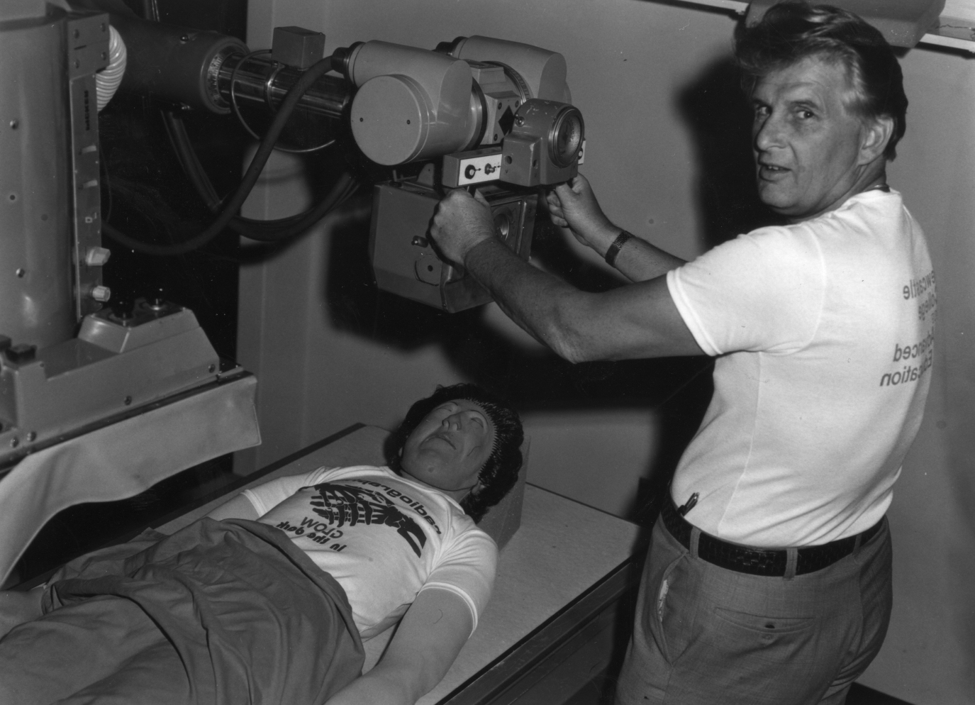 An unidentified technician operates an x-ray machine with a mannequin on the table, Newcastle College of Advanced Education, Australia