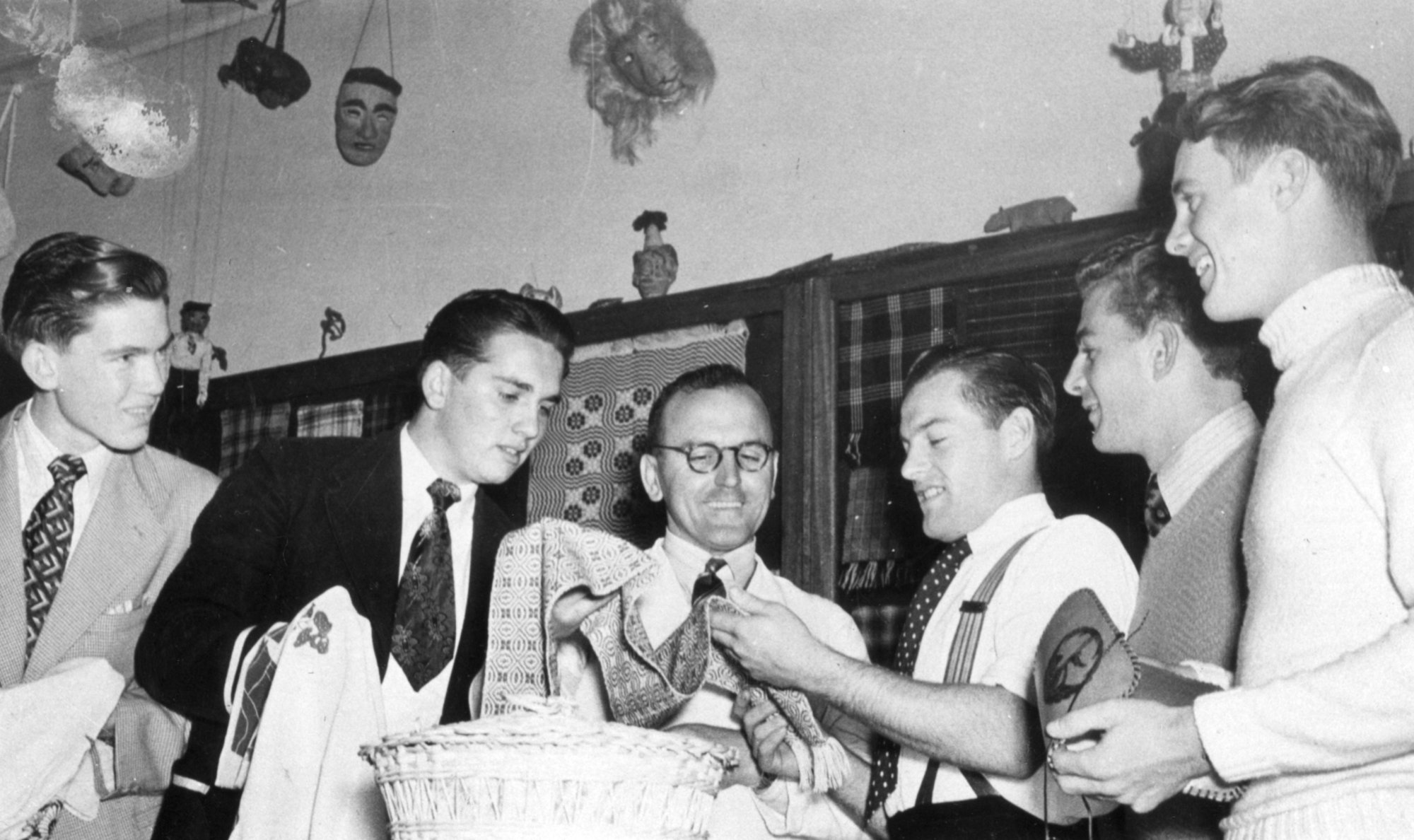 Six unidentified men inspecting clothing, Newcastle College of Advanced Education, Australia