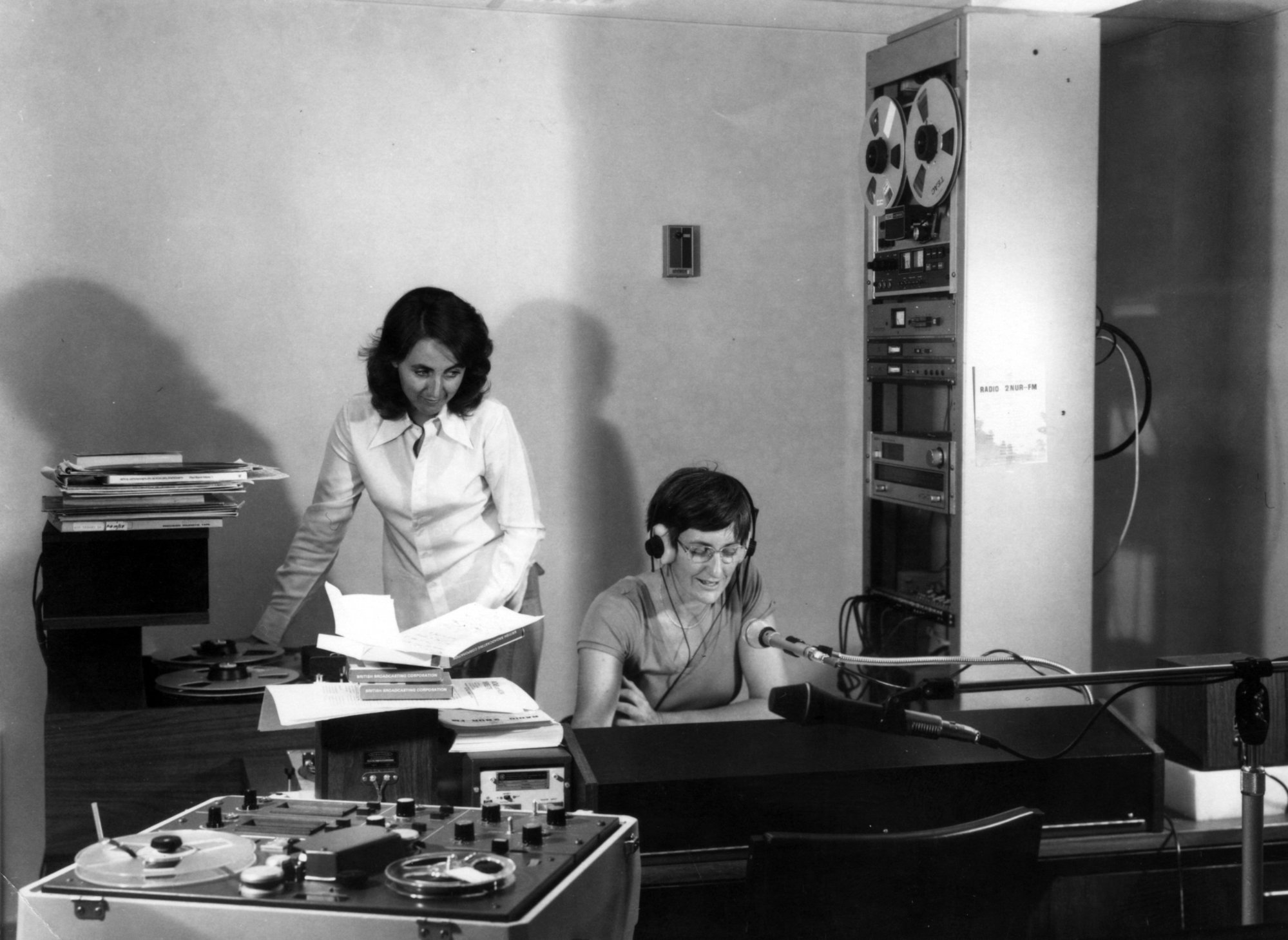 An unidentified radio announcer with an unidentified woman behind her, the University of Newcastle, Australia, [P3003-6]. Living Histories, accessed 17/04/2026, https://livinghistories.newcastle.edu.au/nodes/view/40680