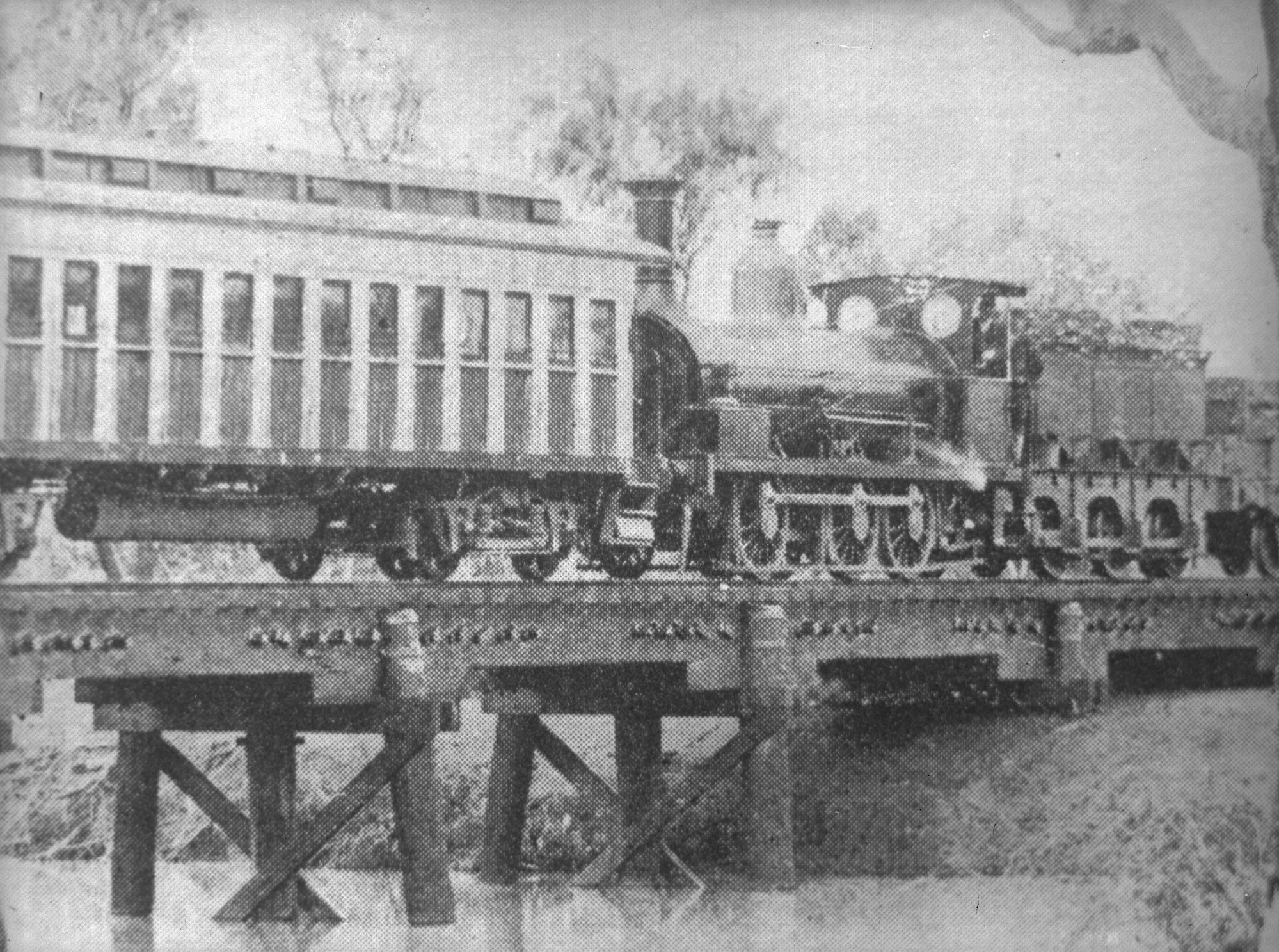 NSWGR A-93 Class (later Z19) pushing Code FA passenger car across bridge, [1880s] ([1900]), [ARHSBox024_0735]. Living Histories, accessed 10/03/2026, https://livinghistories.newcastle.edu.au/nodes/view/4088