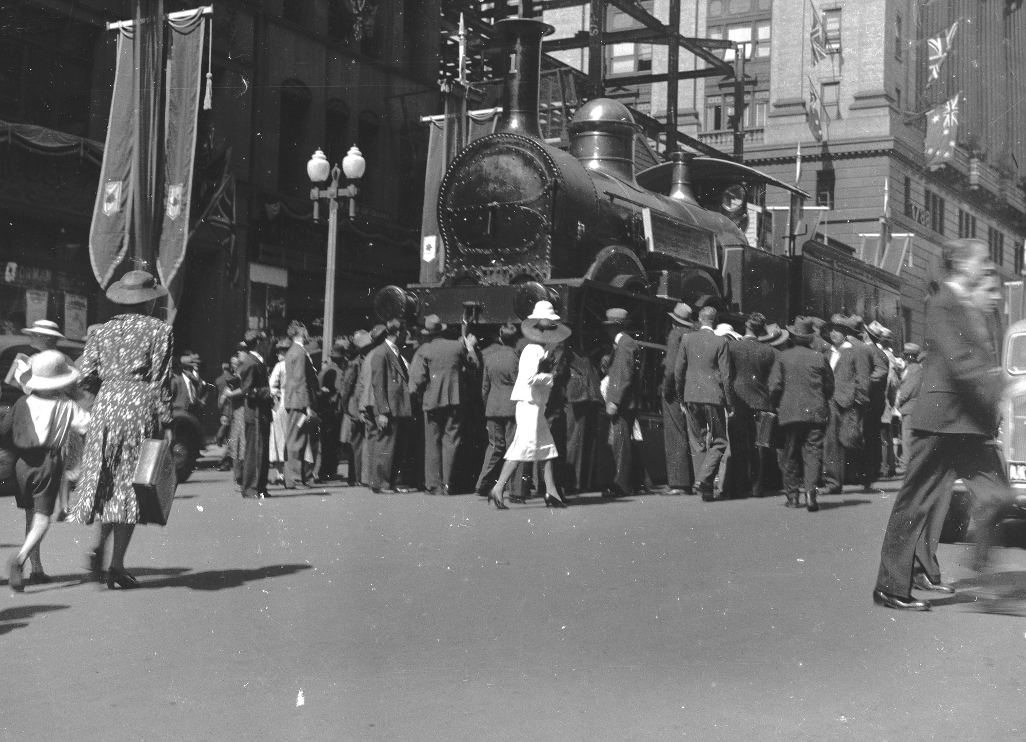 NSWGR, 1 Class No. 1, on display for 75th Anniversary of Railways, Martins Place, Sydney, [1930] ([1930]), [ARHSBox023_0720 ]. Living Histories, accessed 22/04/2026, https://livinghistories.newcastle.edu.au/nodes/view/4095