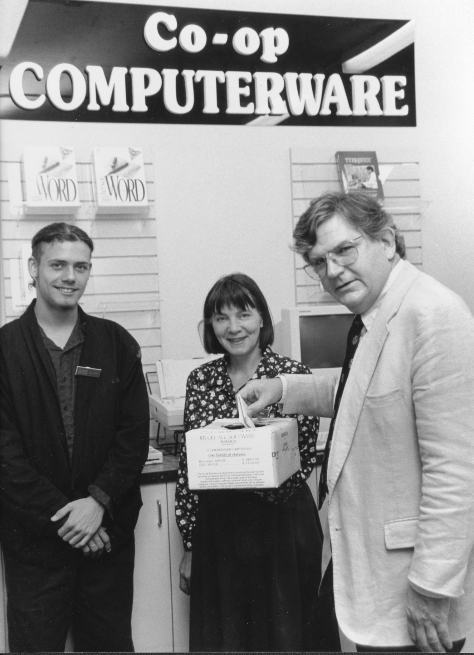 Co-op prize draw (computerware) – Vice-Chancellor, Professor Raoul Mortley with Co-op Staff, the Univesity of Newcastle, Australia, [P2999-88]. Living Histories, accessed 09/03/2026, https://livinghistories.newcastle.edu.au/nodes/view/41112