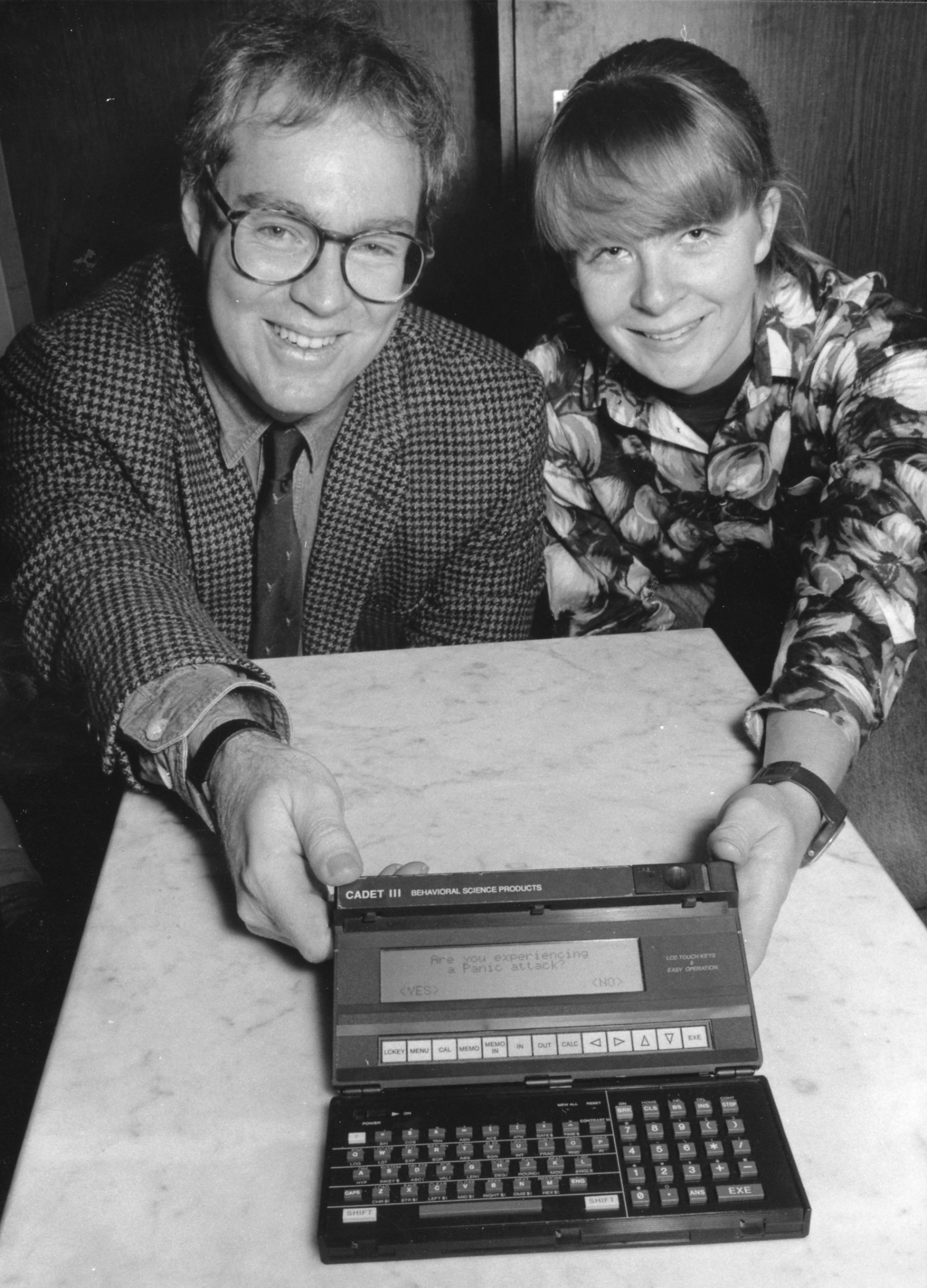 Dr Justin Kenardy and Ms Catherine Adams showing the Cadet III Behavioural Science Product to be used in panic disorder study, the University of Newcastle, Australia - 1991