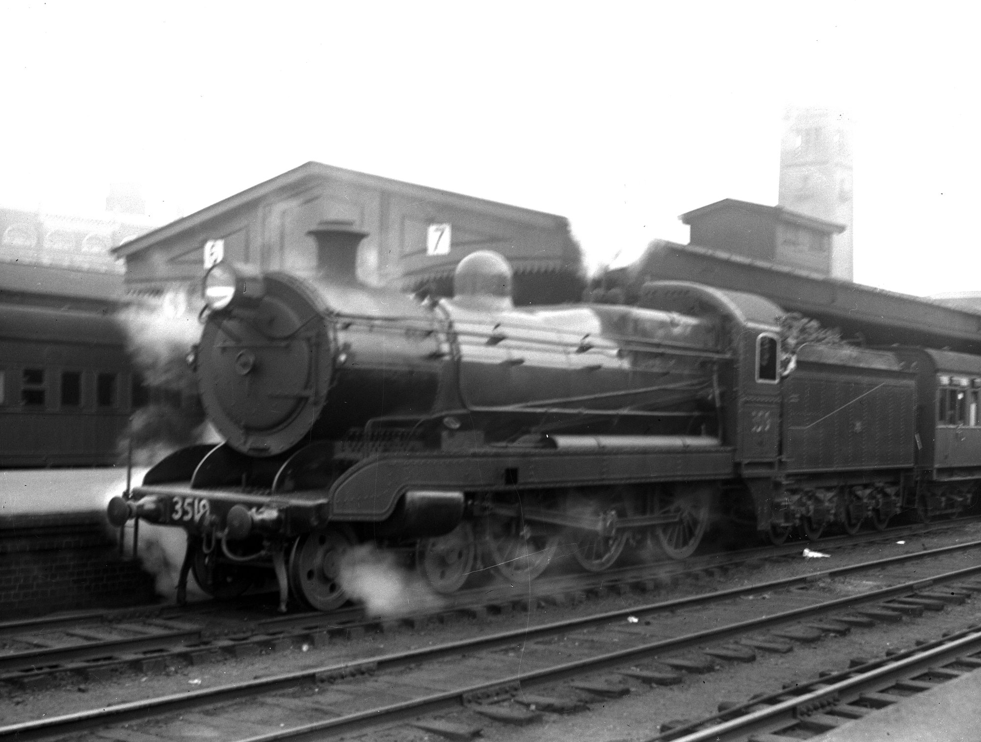 NSWGR C35 Class No. 3519 4-6-0 Ten-wheeler Type express passenger locomotive in rebuilt condition in green livery at Central Station, [1940] ([1940]), [ARHSBox022_0668]. Living Histories, accessed 20/03/2026, https://livinghistories.newcastle.edu.au/nodes/view/4164