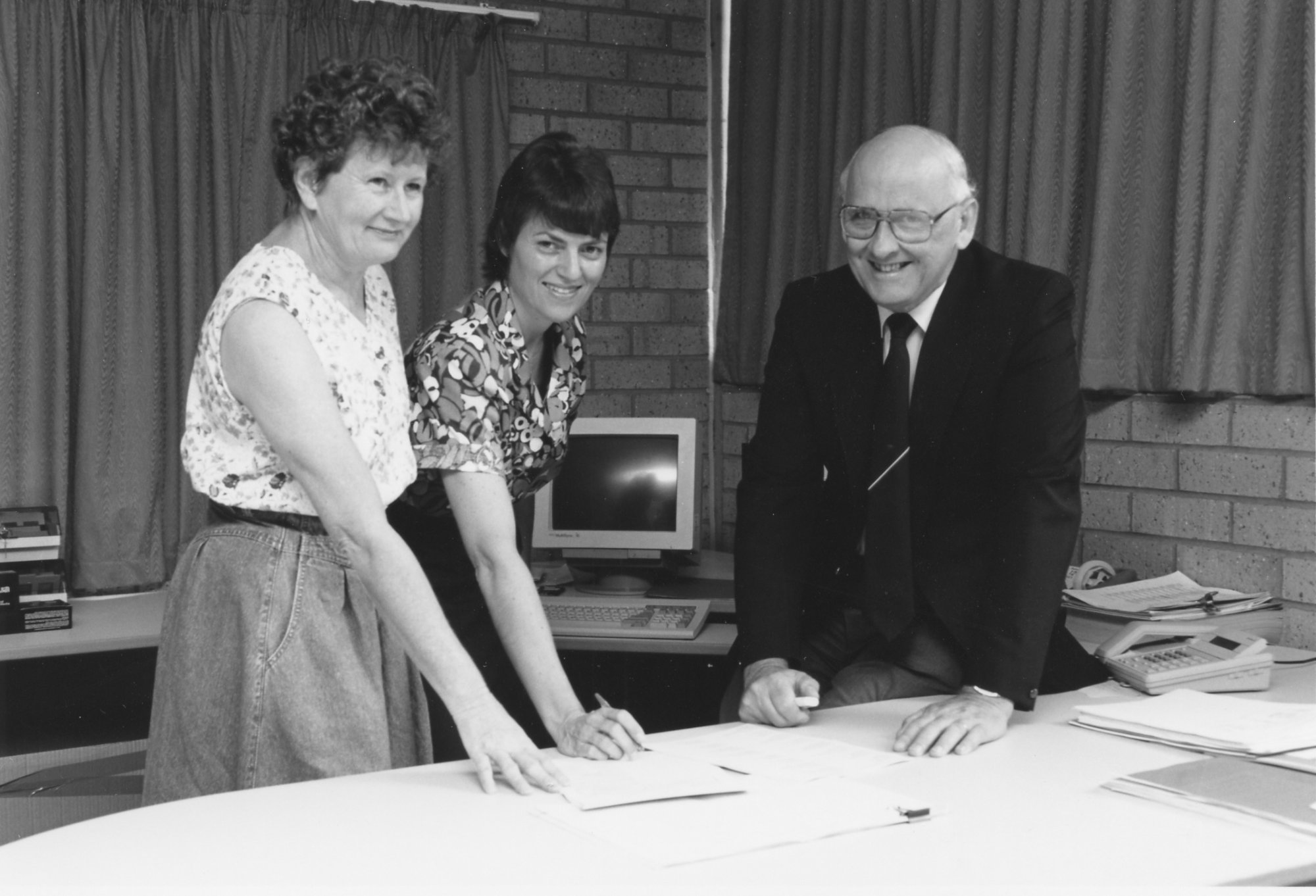 Professor Brian Engel with two unidentified people, the University of Newcastle, Australia, [P2992-75]. Living Histories, accessed 15/01/2026, https://livinghistories.newcastle.edu.au/nodes/view/42393