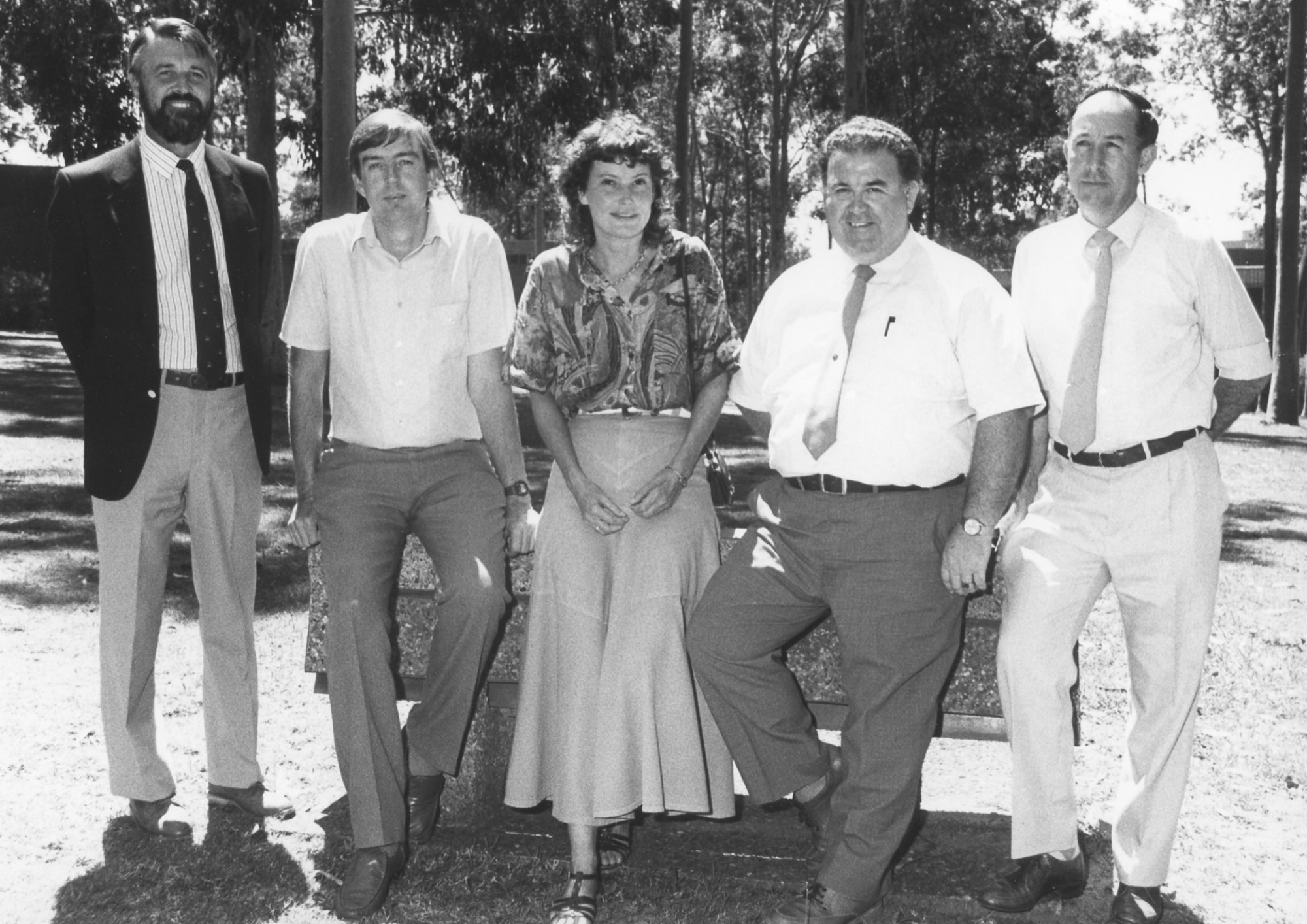 Professor Sid Bourke (Education), with four unidentified [academics], the University of Newcastle, Australia, [P2992-41]. Living Histories, accessed 18/03/2026, https://livinghistories.newcastle.edu.au/nodes/view/42431