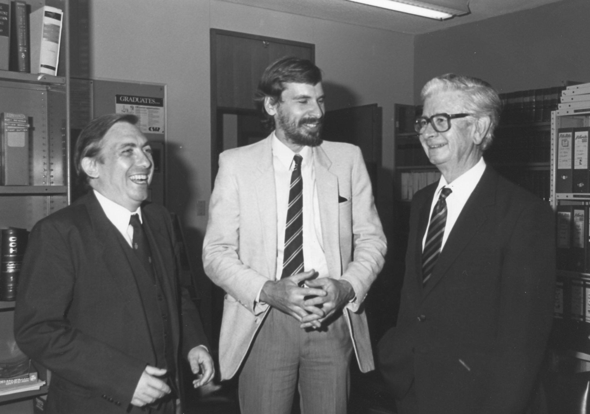Professor Frank Bates, an unidentified man and [Jim Comerford], the University of Newcastle, Australia, [P2991-81]. Living Histories, accessed 16/02/2026, https://livinghistories.newcastle.edu.au/nodes/view/42496