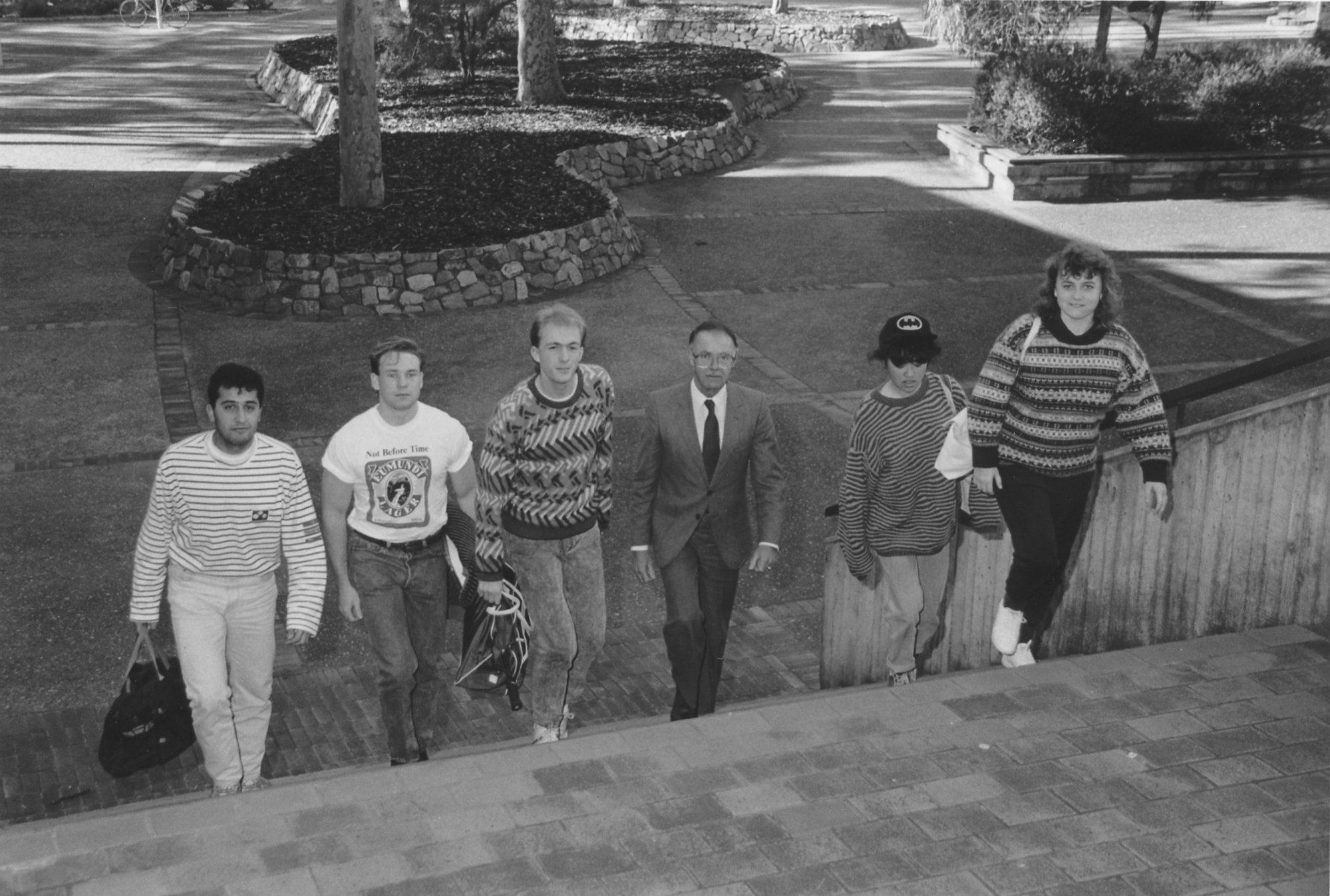 Professor Ken Dutton and Colin Goodger (3rd from left) with unidentified students on the Auchmuty Library steps, the University of Newcastle, Australia