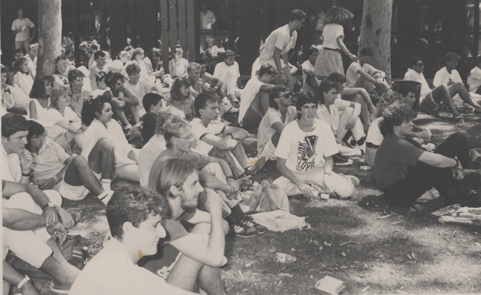 Students sit on the ground in the Shortland Union Courtyard, the University of Newcastle, Australia, [P2988-17]. Living Histories, accessed 20/03/2026, https://livinghistories.newcastle.edu.au/nodes/view/43425