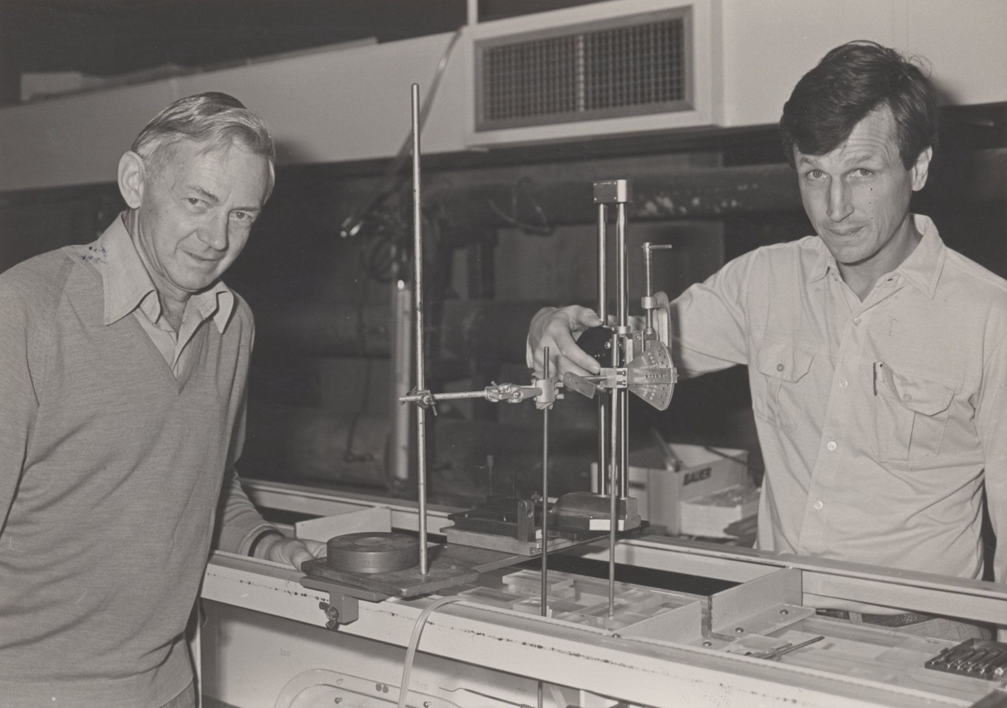 Dr Bert Browne and John Chambers with the wind tunnel used to measure coherent structures in turbulence generated by a cylinder, the University of Newcastle, Australia, [P2718]. Living Histories, accessed 16/04/2026, https://livinghistories.newcastle.edu.au/nodes/view/43881