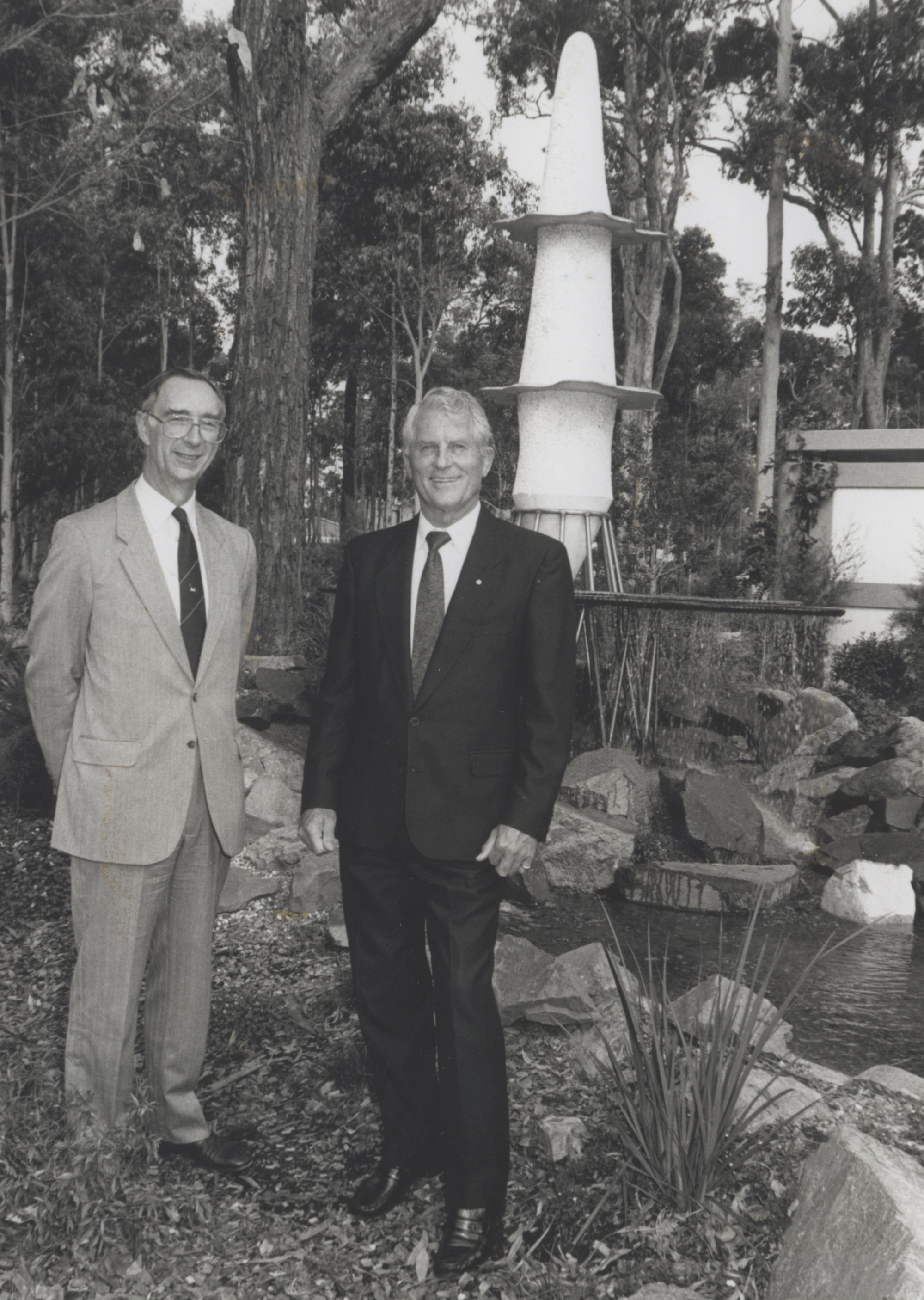 Tim Besley (r) with Vice-Chancellor, Professor Keith Morgan, in front of a fountain at the University of Newcastle, Australia, [P2528]. Living Histories, accessed 20/03/2026, https://livinghistories.newcastle.edu.au/nodes/view/44084
