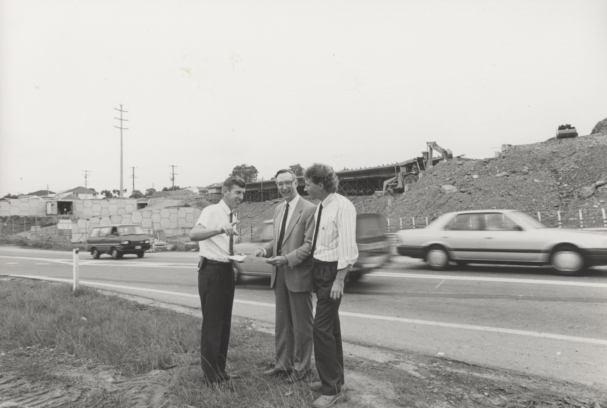 The Resident Engineer, Mr Kevin Hays (l) and the Project Manager for State Highway 23, Mr Bob Hanley, explain to the Vice-Chancellor Professor Keith Morgan, how the traffic in Rankin Drive will be directed onto the interchange behind them, Australia, [P2322]. Living Histories, accessed 15/04/2026, https://livinghistories.newcastle.edu.au/nodes/view/44627