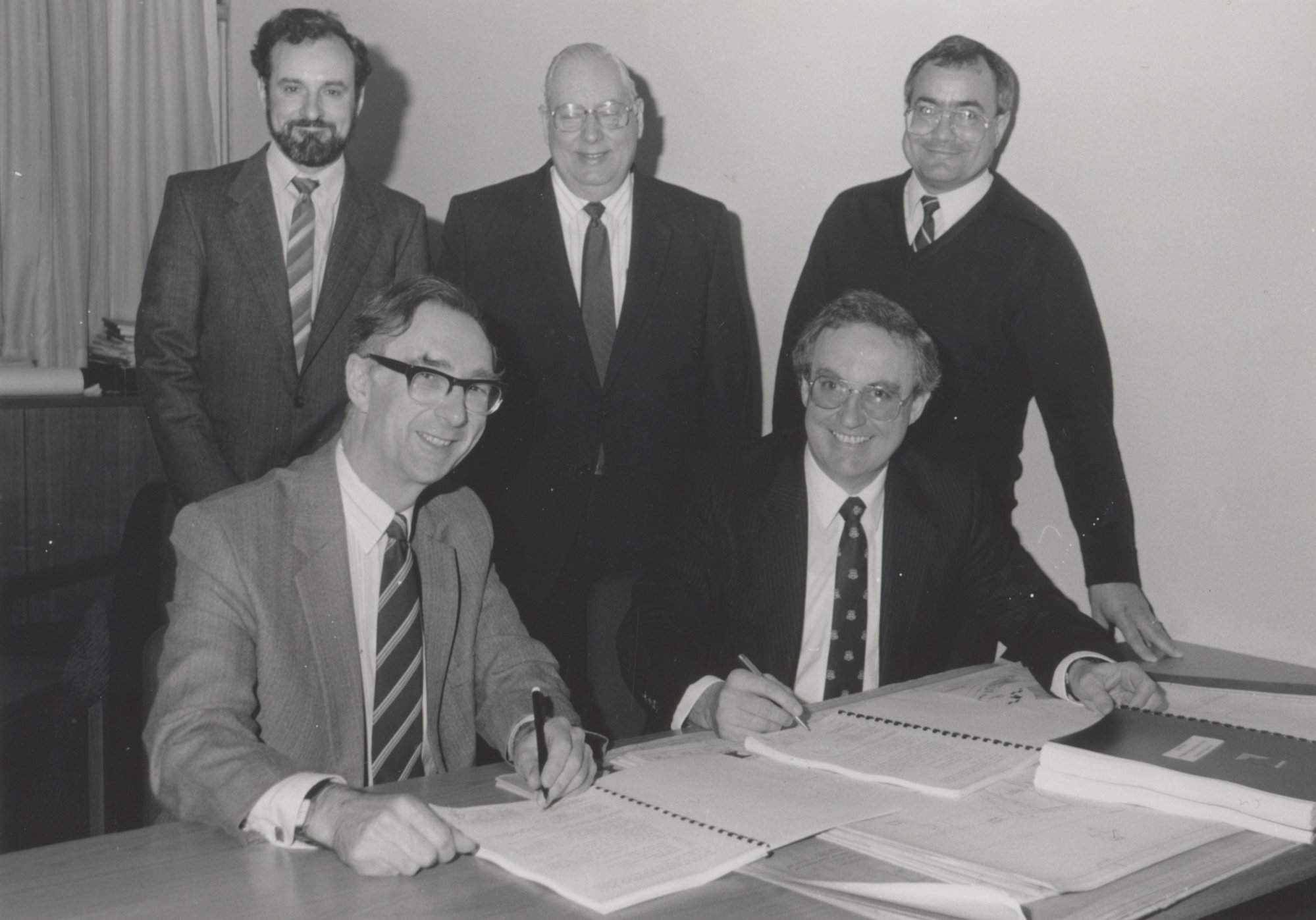 The Vice-Chancellor Professor Keith Morgan, and an Associate Director of Leightons, Mr Bob Service sign documents, the University of Newcastle, Australia - 1990, [P2319]. Living Histories, accessed 09/03/2026, https://livinghistories.newcastle.edu.au/nodes/view/44630