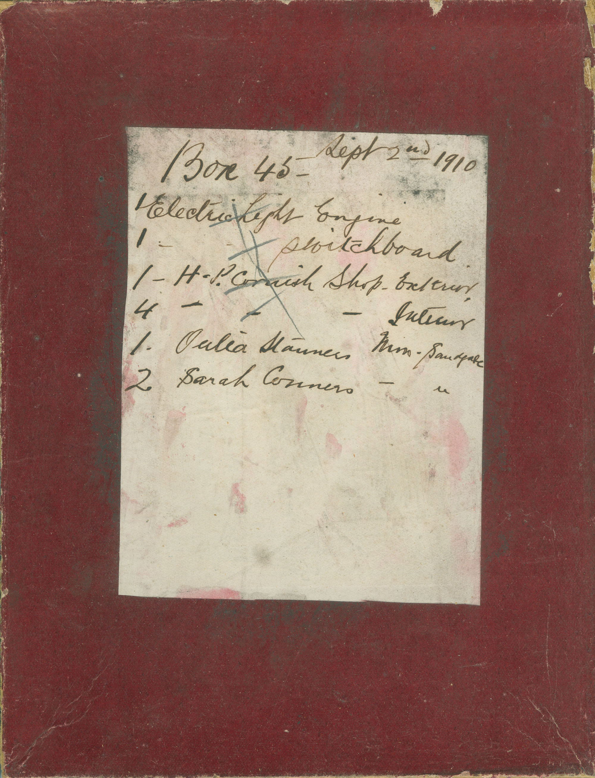 Ralph Snowball Collection, original glass plate box listing, Box 45, 2 September 1910