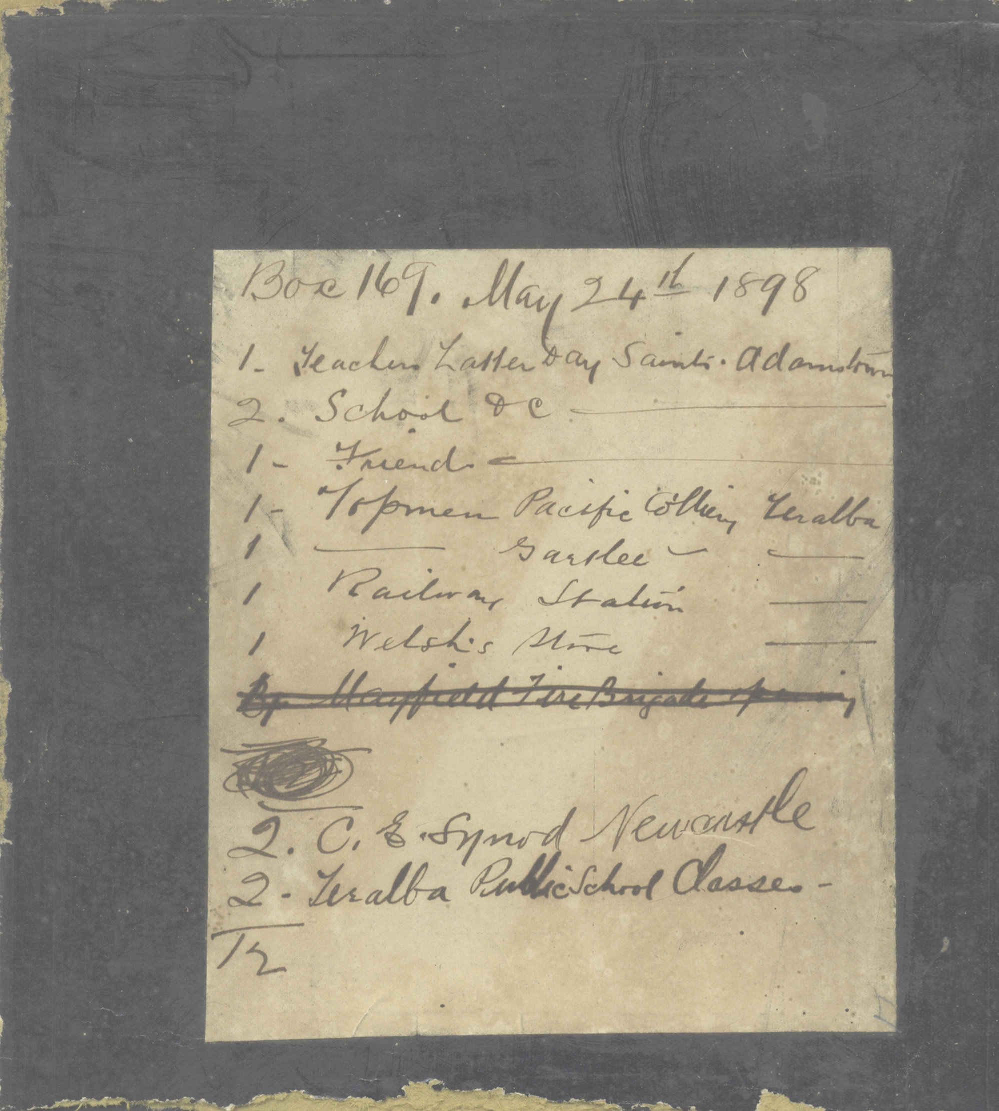 Ralph Snowball Collection, original glass plate box listing, Box 169, 24 May 1898 (24th May 1898). Living Histories, accessed 19/03/2026, https://livinghistories.newcastle.edu.au/nodes/view/45172