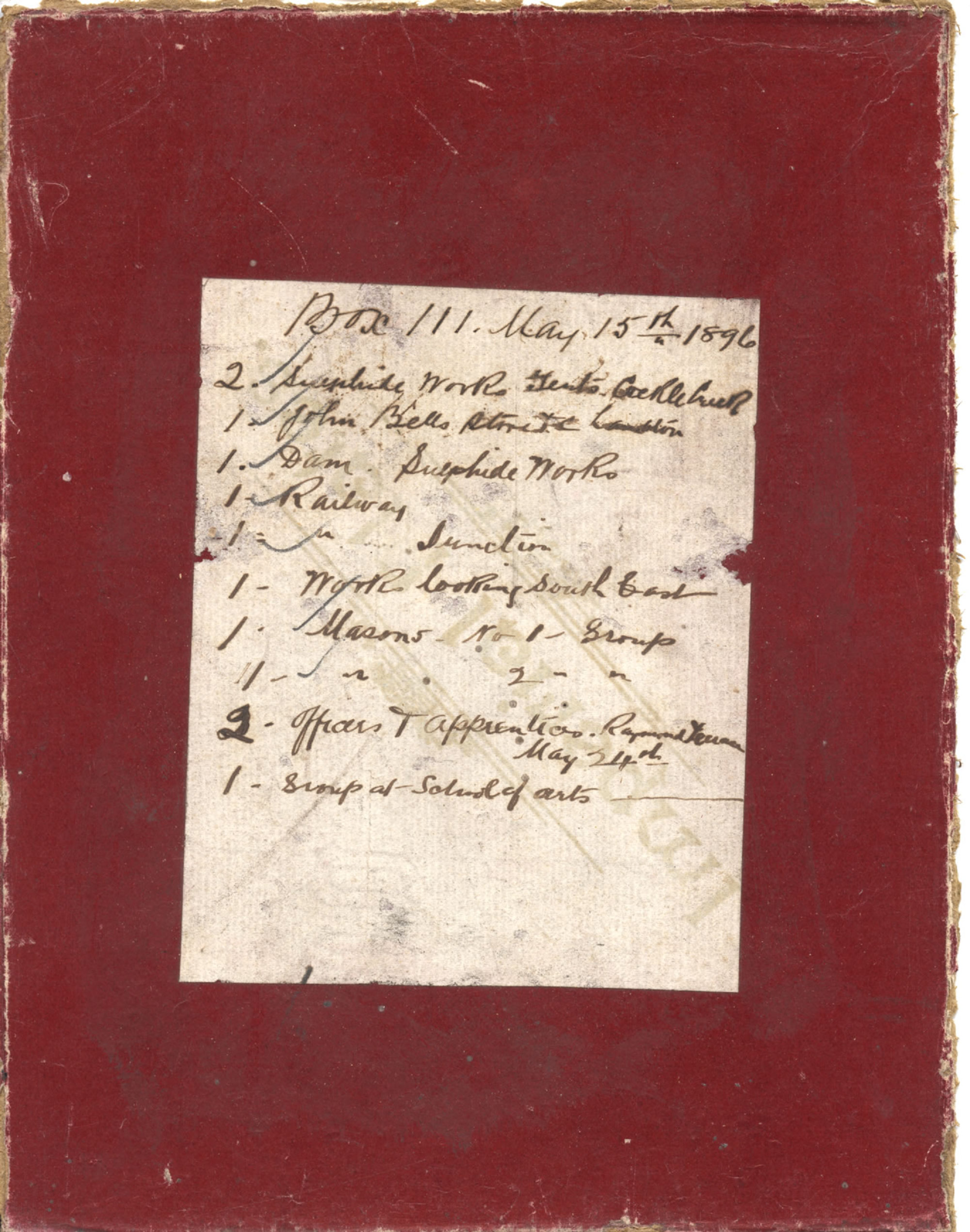 Ralph Snowball Collection, original glass plate box listing, Box 111, 15 May 1896