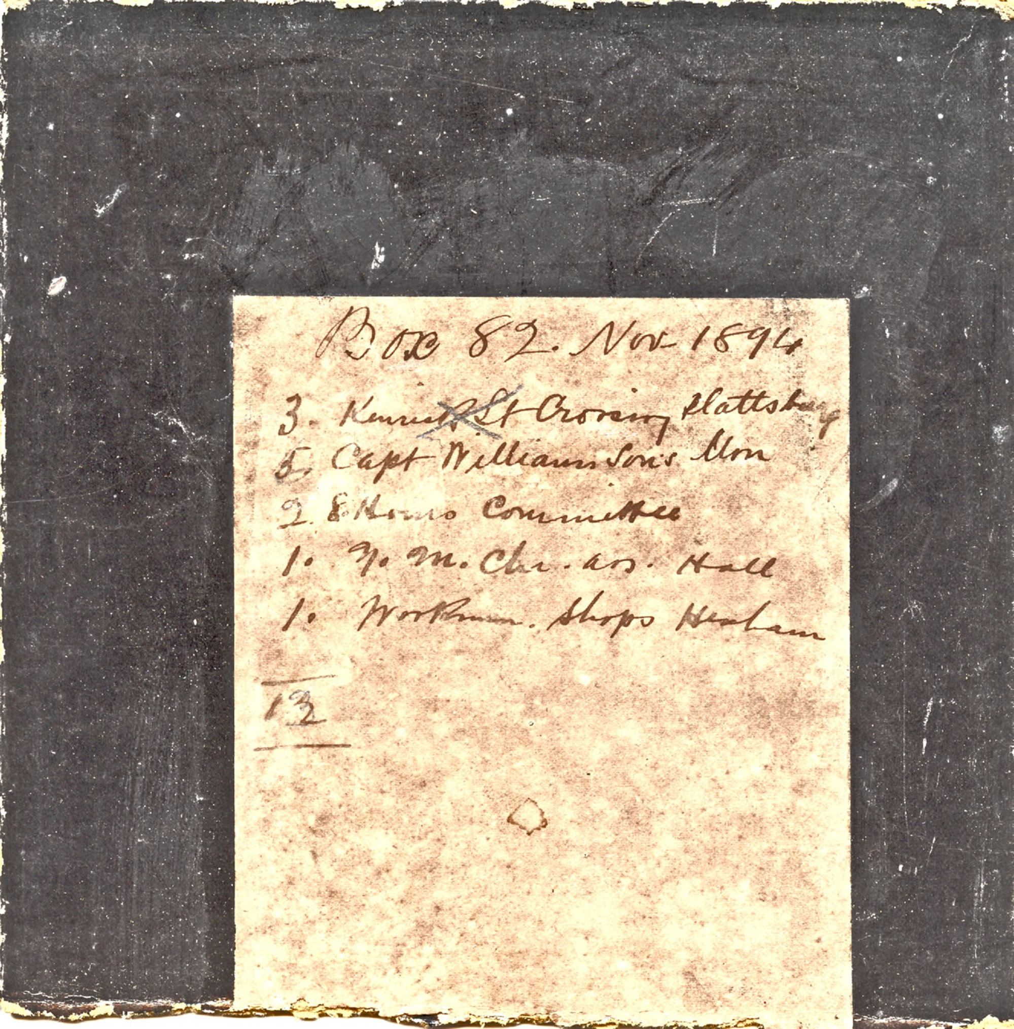 Ralph Snowball Collection, original glass plate box listing, Box 82, November 1894
