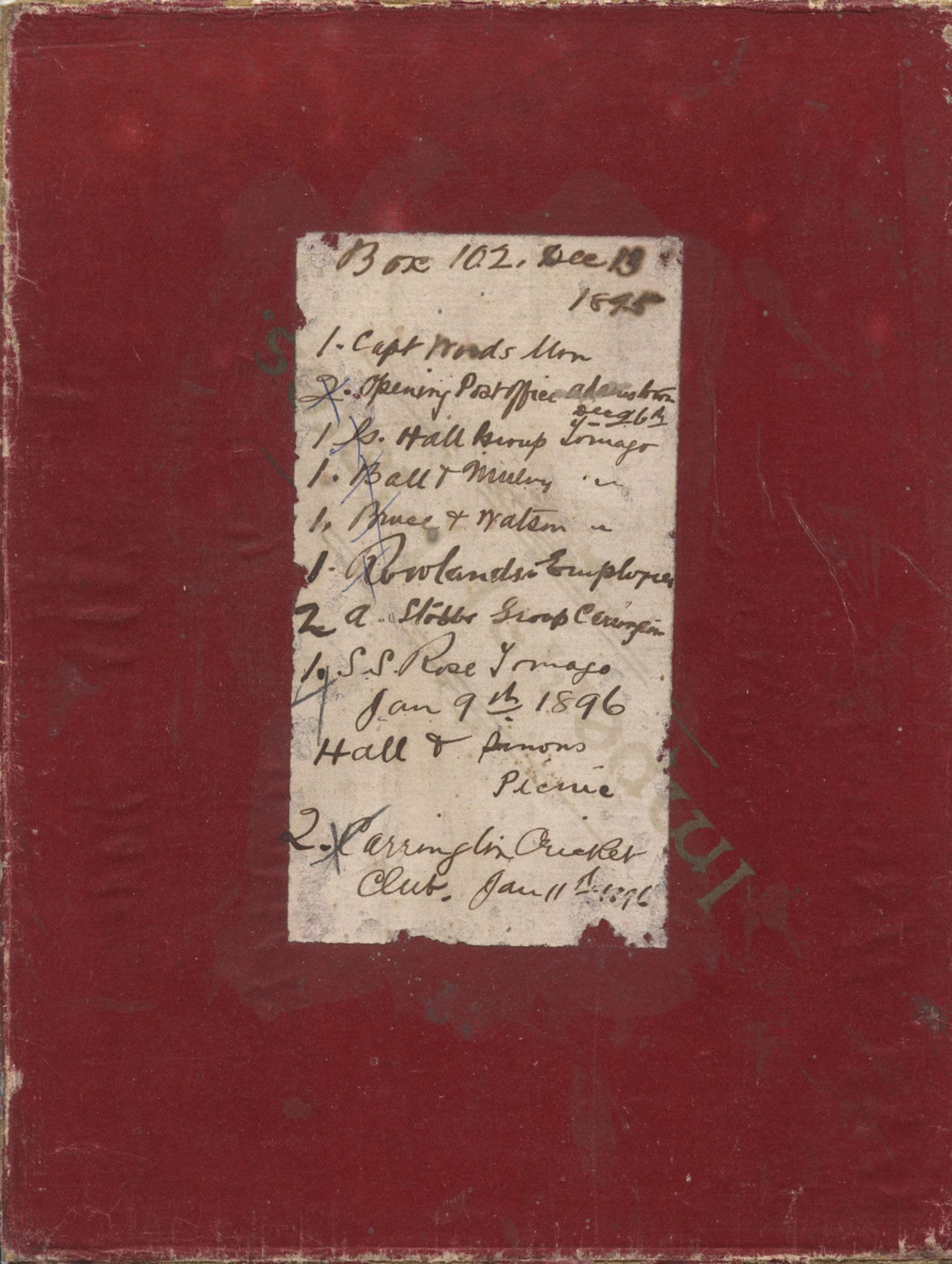 Ralph Snowball Collection, original glass plate box listing, Box 102, 13 December 1895