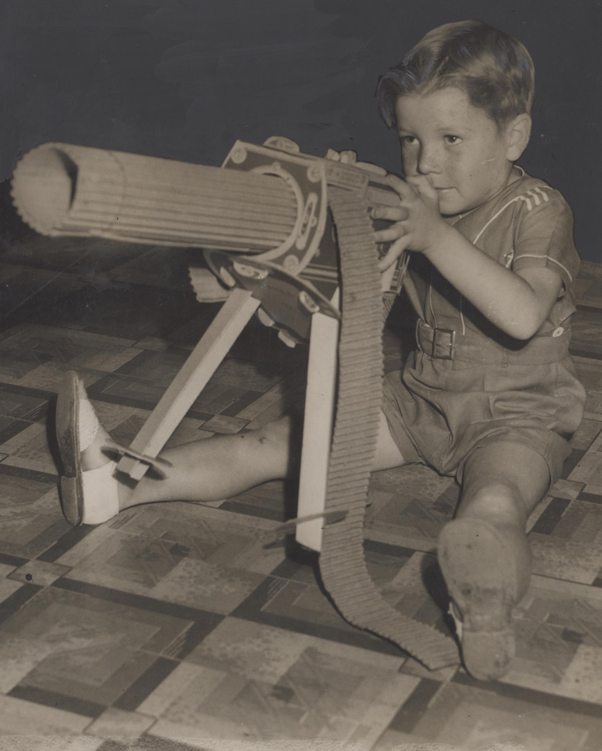 Haslam, Percy Arthur, 1913-1987, Child playing with toy machine gun - January 1942 (1942-01), [A5417(i)]. Living Histories, accessed 25/01/2026, https://livinghistories.newcastle.edu.au/nodes/view/45368