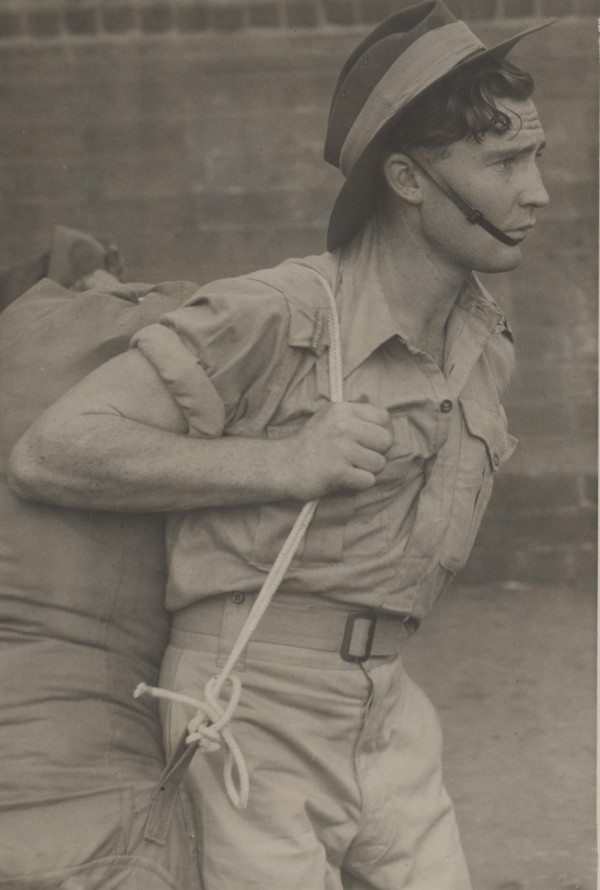 Australian soldier, Private B. Huxley shoulders his kit at Maitland station, 4 March 1946