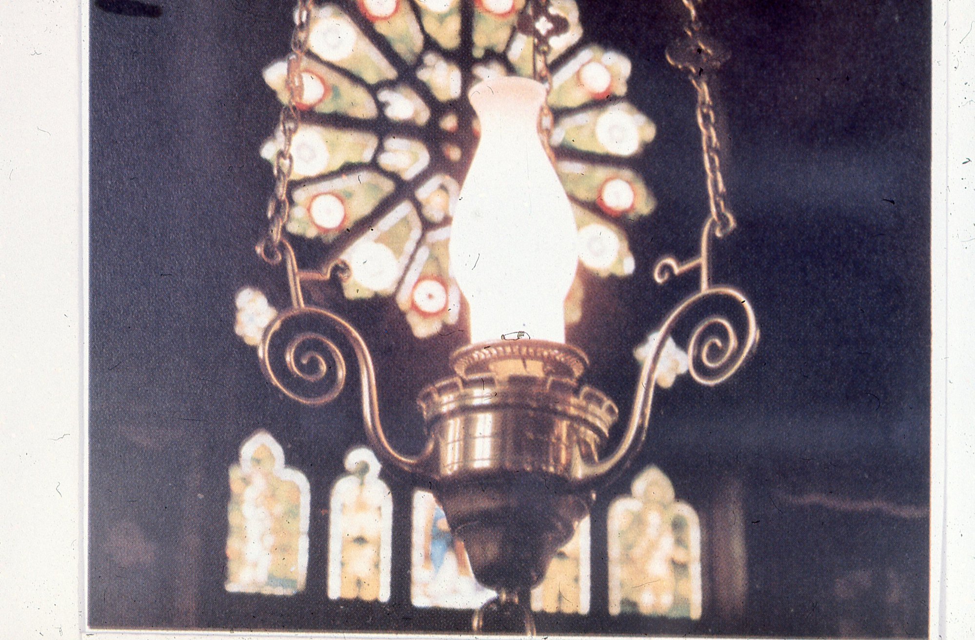 Light fitting and stained glass, St Barnabas Church, Norfolk Island, [1980s] ([1980s]), [C918-0838]. Living Histories, accessed 15/04/2026, https://livinghistories.newcastle.edu.au/nodes/view/4544